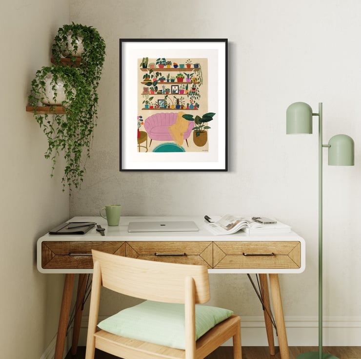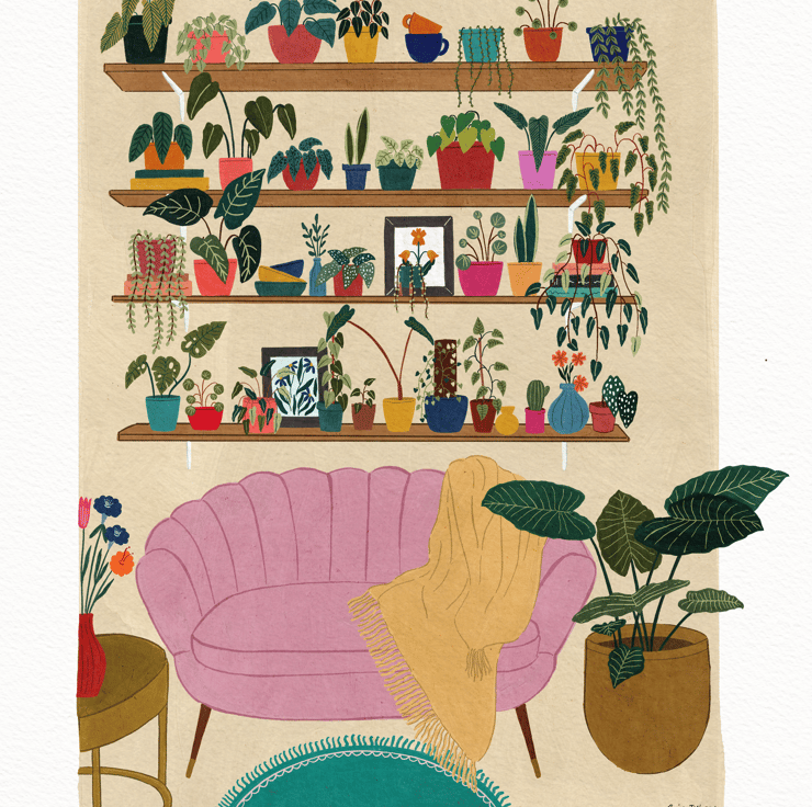 Bring the beauty of nature indoors with our stunning still life illustration of a living room filled with verdant plants.