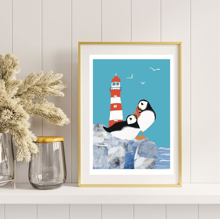 Another original design by The Hedgerow featuring two lovely puffins sat on a their nest under a lighthouse. A perfect coastal print for any home.