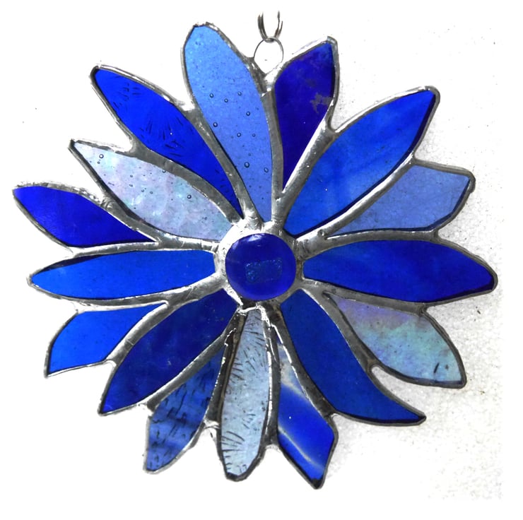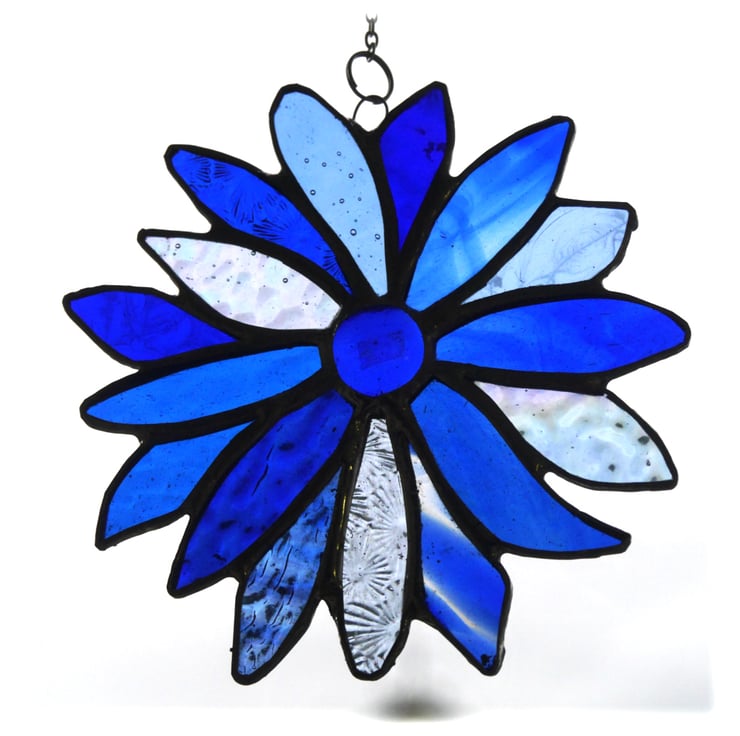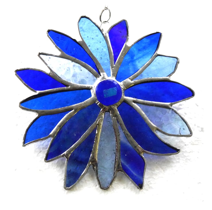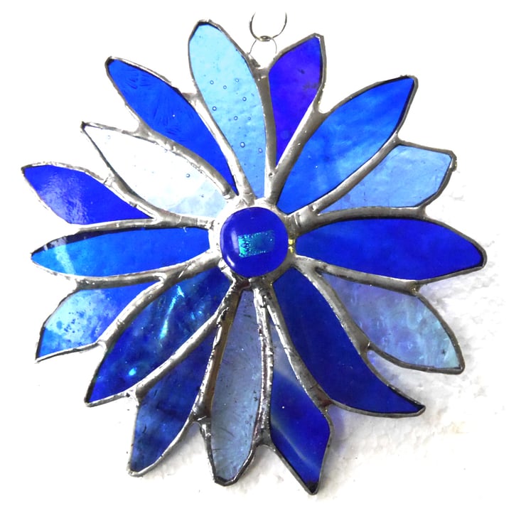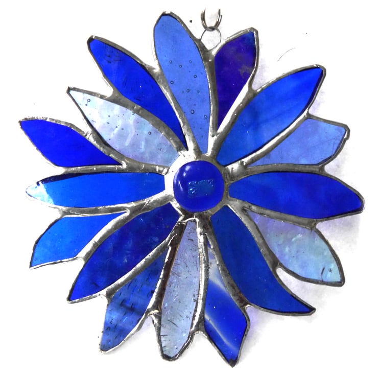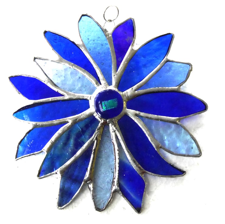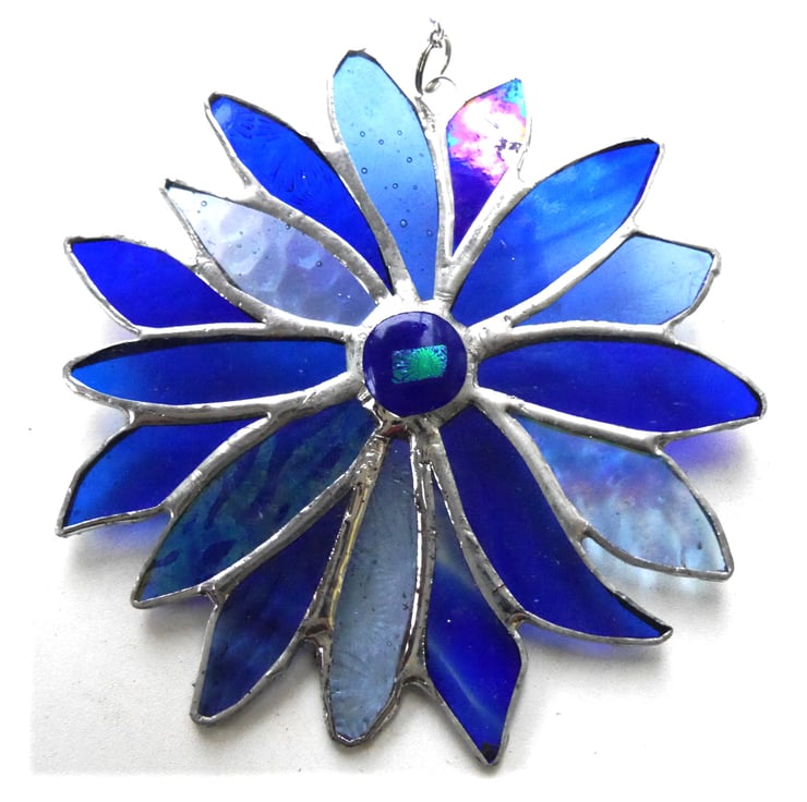 The flower has 16 petals, all slightly different shapes and types of blue glass. In the centre is a special blue glass nugget with dfichroic accents which I fused in my kiln.