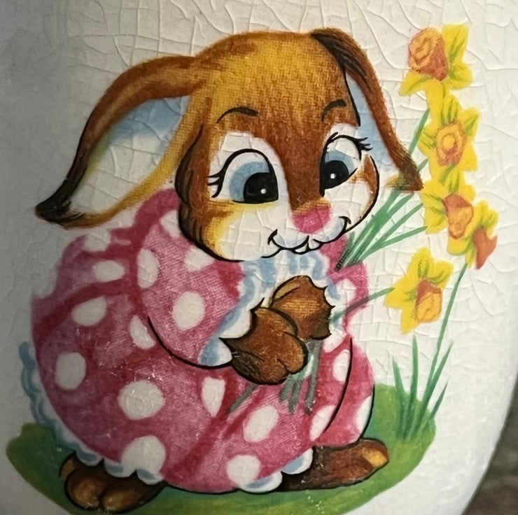 I love finding little pieces of vintage china which can be repurposed into pin cushions with a little scrap of linen and some embroidery thread. This egg cup was chipped on the inside and the glaze is crackled but the picture of a little bunny with a bunch of daffodils is still very sweet.