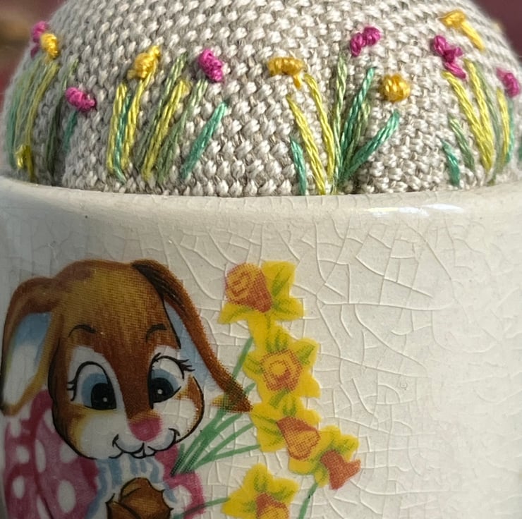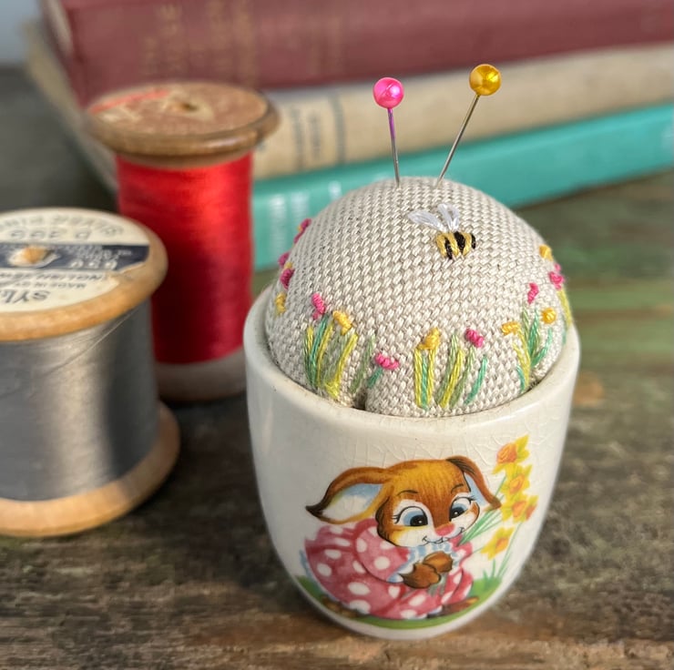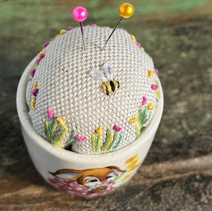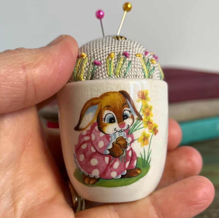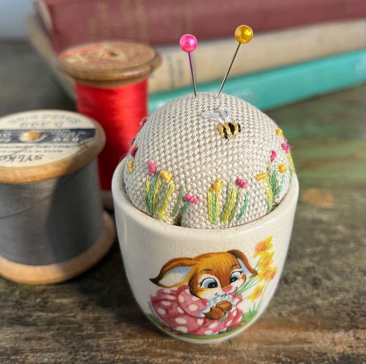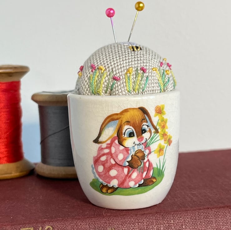 Cute one of a kind pincushion in a novelty Easter bunny egg cup. The beige linen cushion has been embroidered with tiny flowers and a bee.