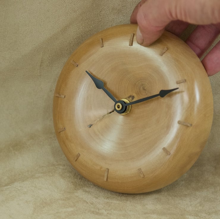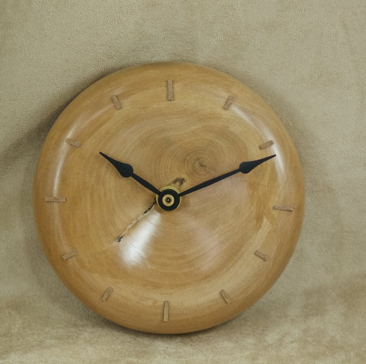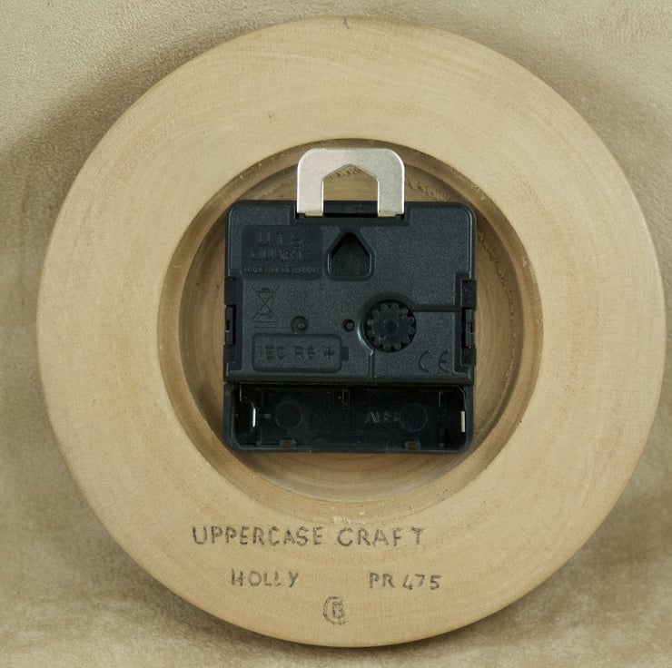 This lovely wood wall clock is hand crafted from a piece of holly wood cut from a tree that was felled from a neighbours garden over 12 years ago. Designed and created in my studio at Clairdale, Sanday, the clock has a shallow bowl turning to a wide, convex rim giving the clock a gentle, soft appearance. The grain swirls around the clock face and has a natural split feature, created by the tree where a small branch grew out of the trunk. The numerals are hand crafted from oak veneer, with the cardinal hours (3, 6, 9, and 12 o'clock) marked with slightly longer strikes than the intermediate hours. The hands are black painted metal, and the clock has an incredibly quiet ticking quartz movement that uses one AA battery (not supplied). There is a wall hanger built in to the top of the movement, so all you need to do is find a nice place in your home for it to live. The clock is 135mm diameter, and 35mm deep.