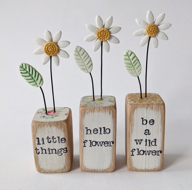 A little clay daisy stands on a wire stalk in a sanded and stamped wooden block.