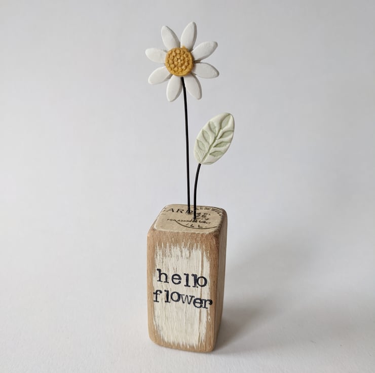 The front of the wooden block is hand stamped with the words 'hello flower'.