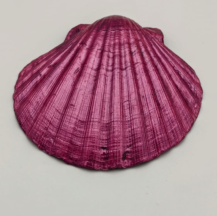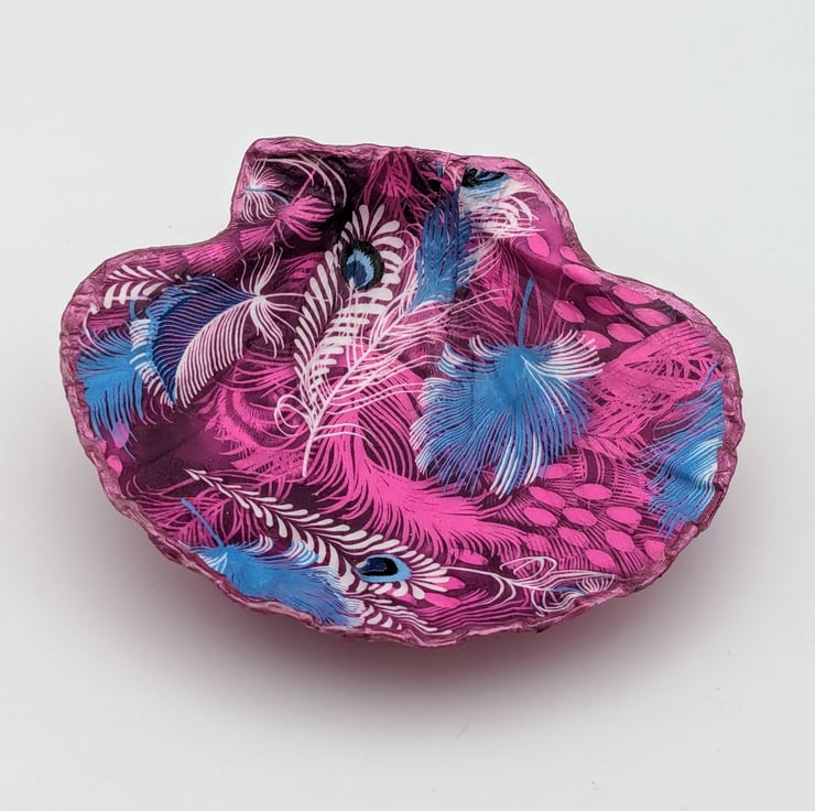 This scallop shell has been decoupaged in purple peacock feather print and handpainted in metallic purple acrylics on the rear and around the edges. The whole item has been sealed, though requires care if cleaned. The item should not be immersed in water.
