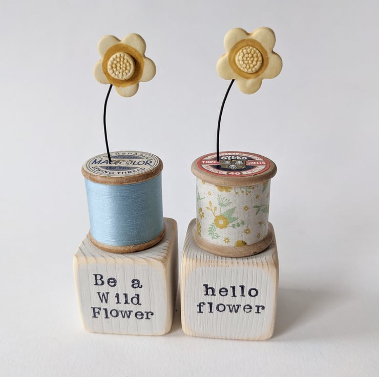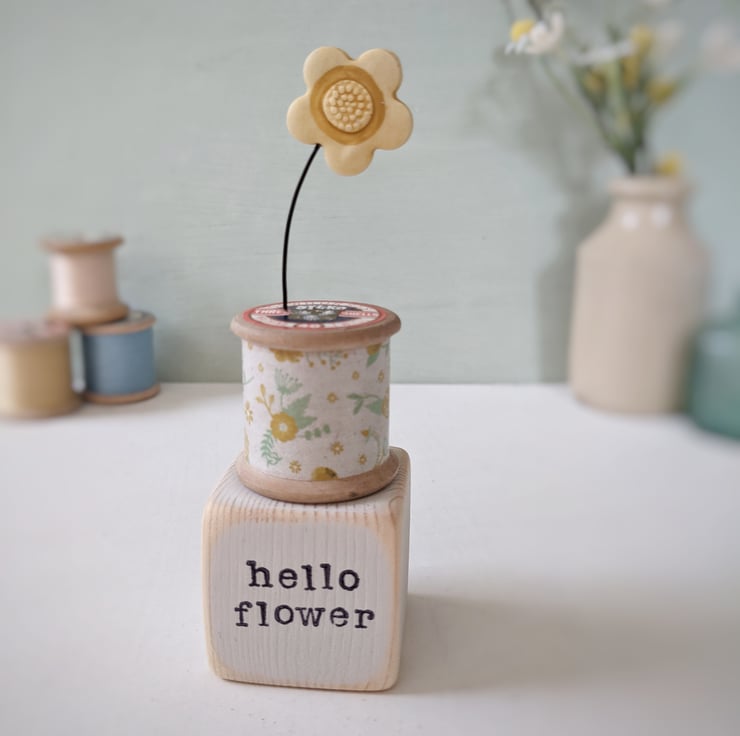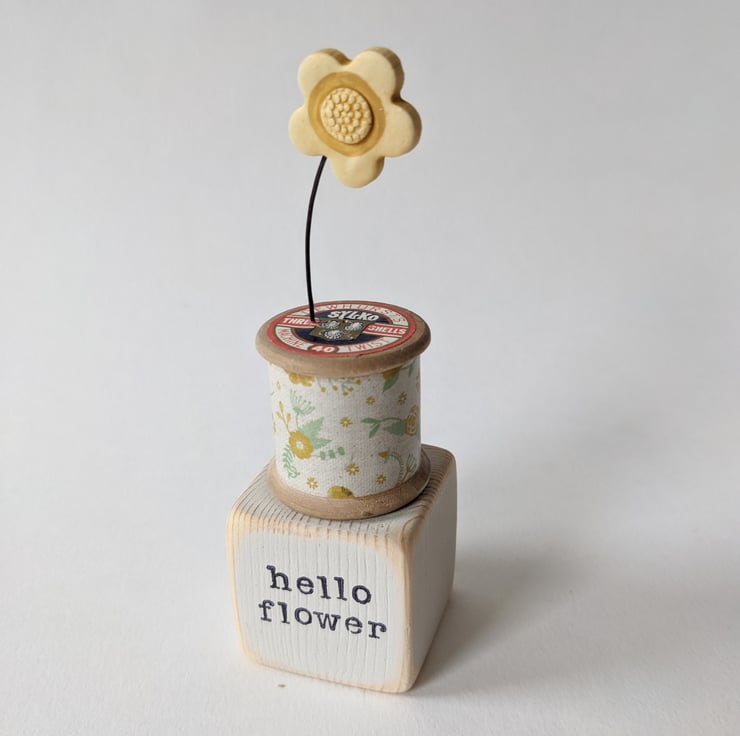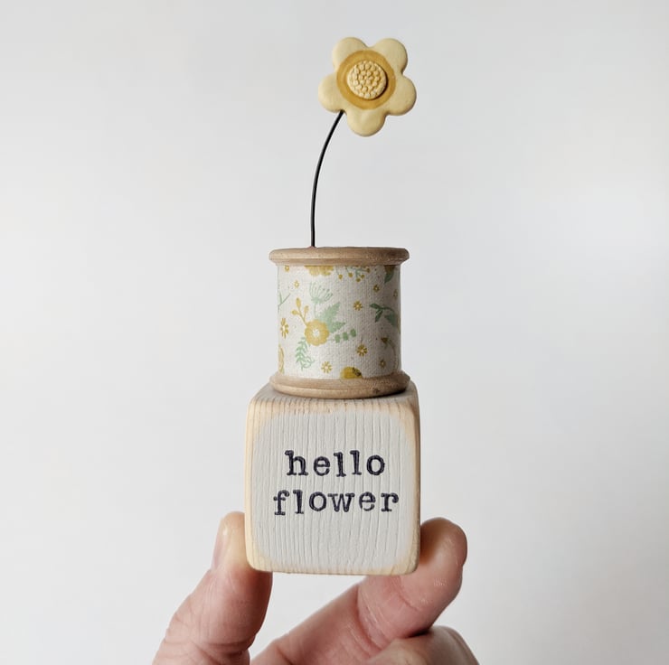 The painted wood block beneath has the hand stamped words 'hello flower'