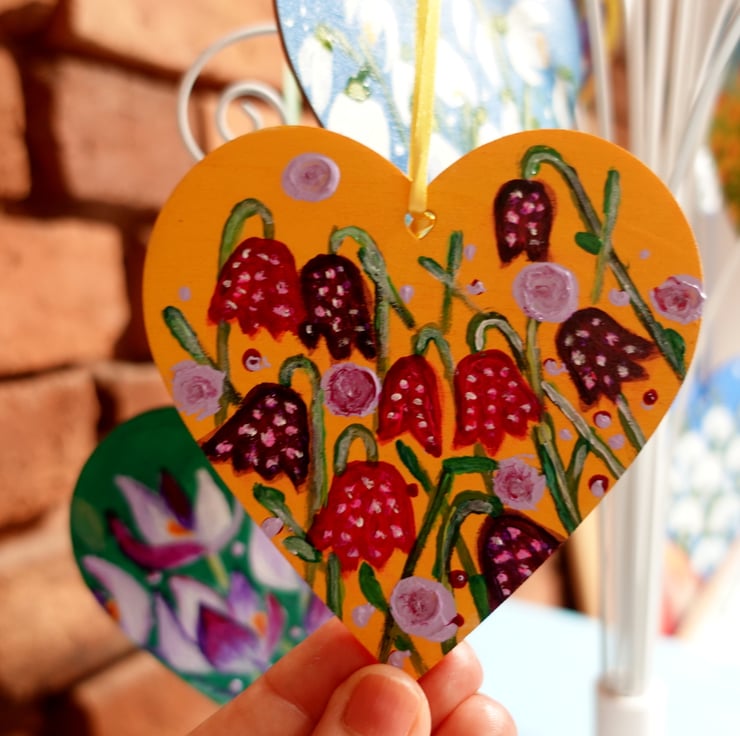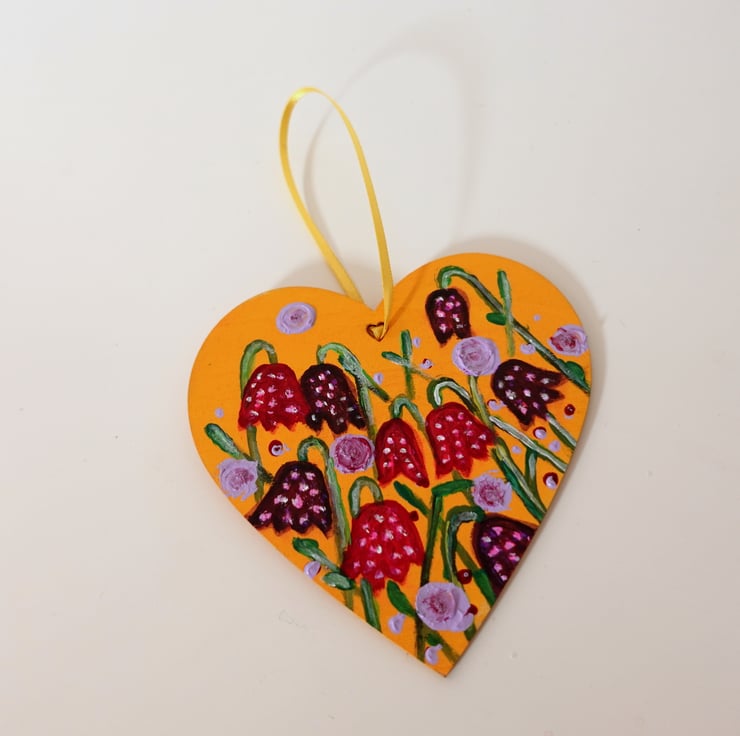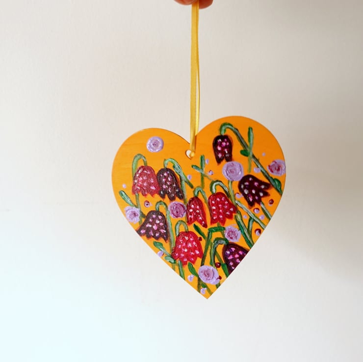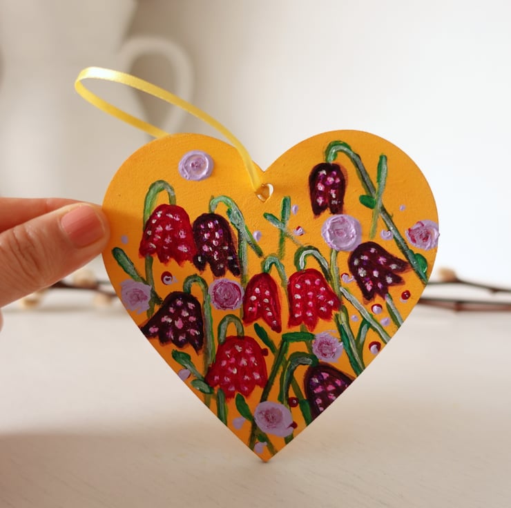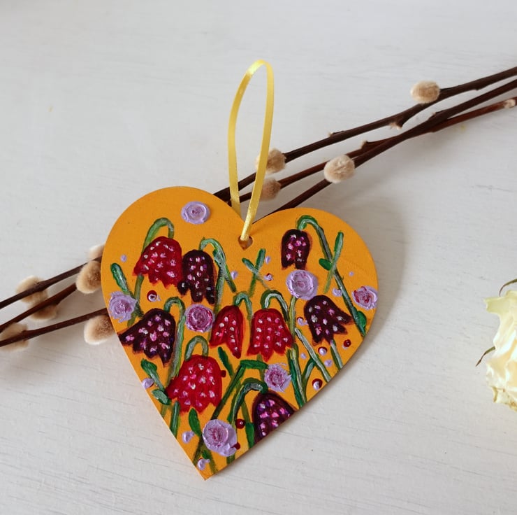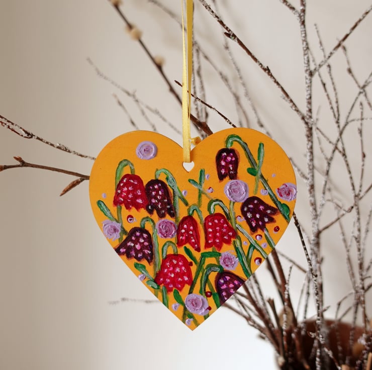 This fritillaria hanging heart measures 4" x 4" and it finishes with a yellow ribbon for hanging. It is varnished for protection and ready to hang, but please don't keep it in the sun as the colours might fade over time.