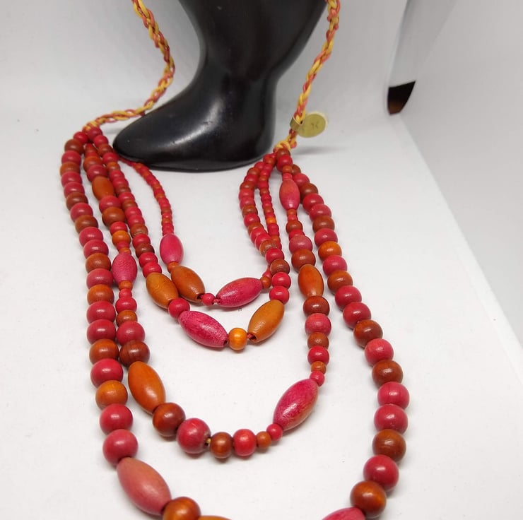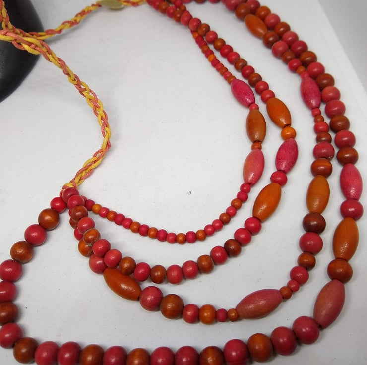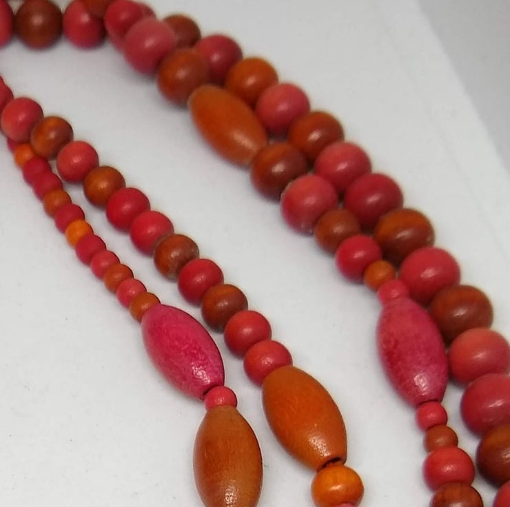 Hand strung with Red rainbow wood rounds and Red and Orange wooden ovals