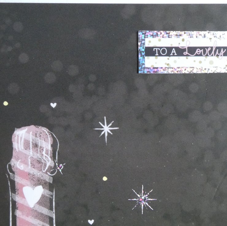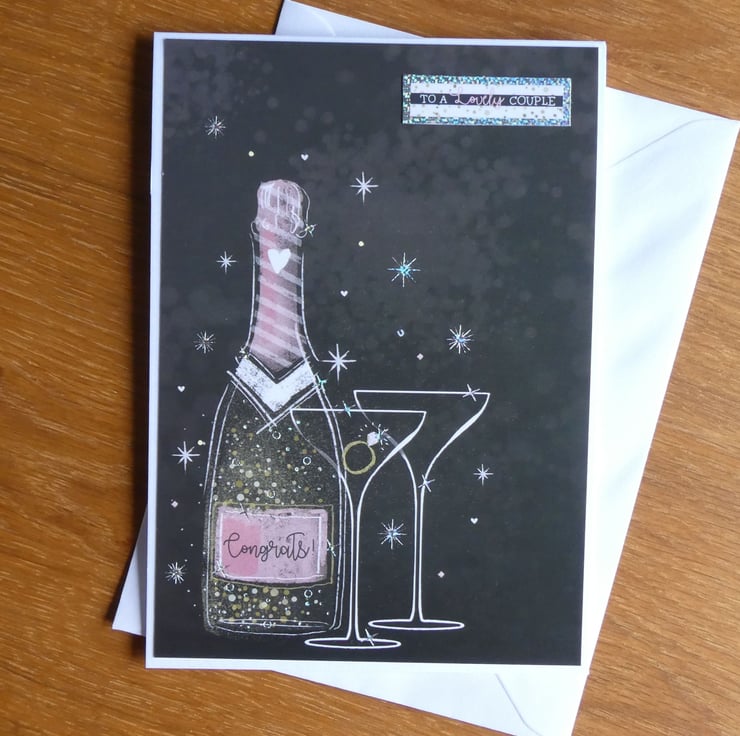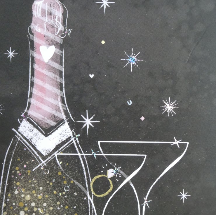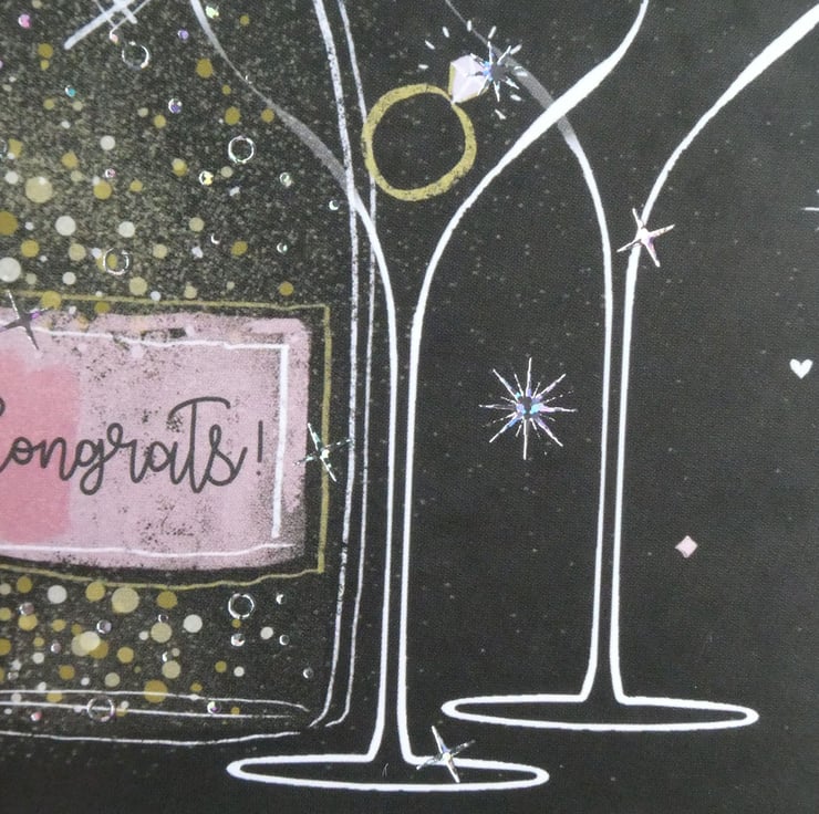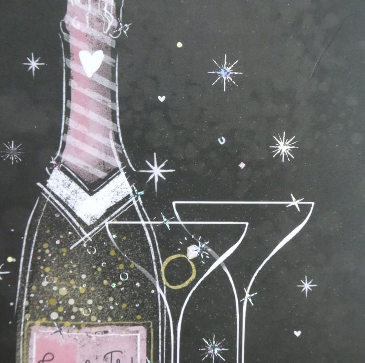 The card has an image of a bottle of champagne next to two glasses, one with a sparkling engagement ring inside, printed on quality gloss card in shades of pink, white, grey and black.