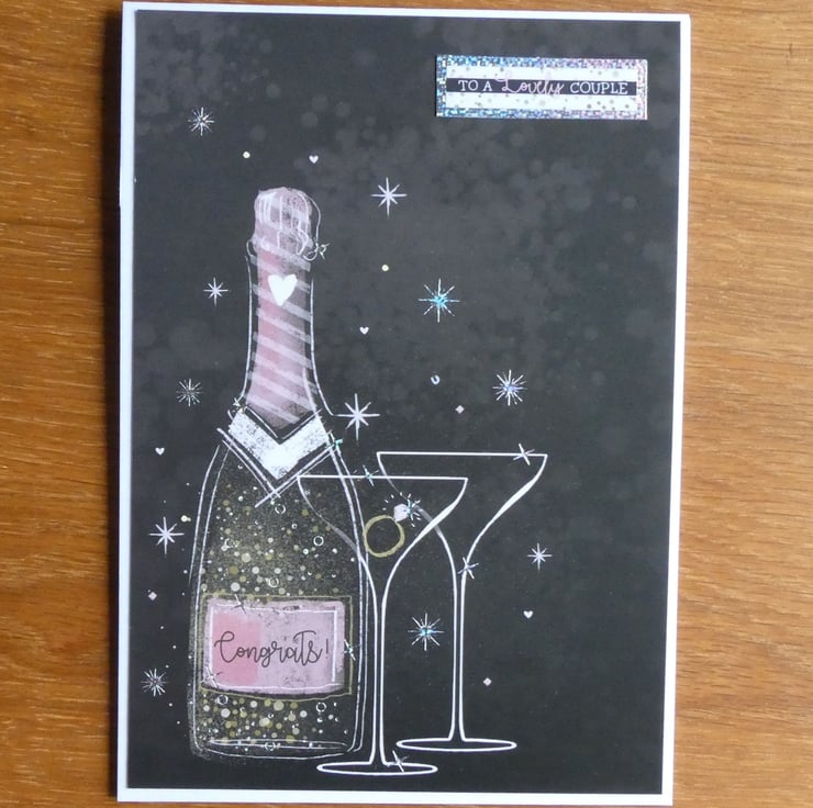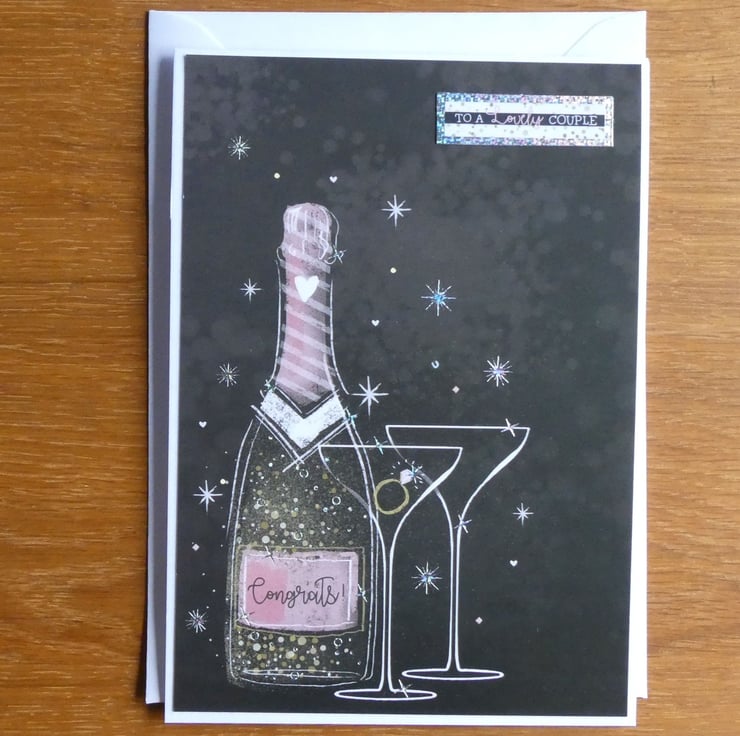 This engagement card has a picture of a champagne bottle with 2 glasses and the messages 'Congrats' and 'To a Lovely Couple'.