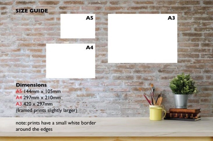 Unless specified, all of the prints are UNFRAMED but are printed in standard sizes, A5, A4, A3, A2 and A1. This makes it much easier to find a frame to suit your needs. There is a white border around each print to allow for the frame recess and for you to add a mount if needed.