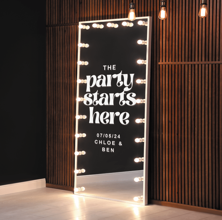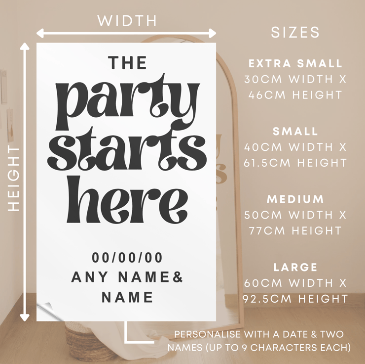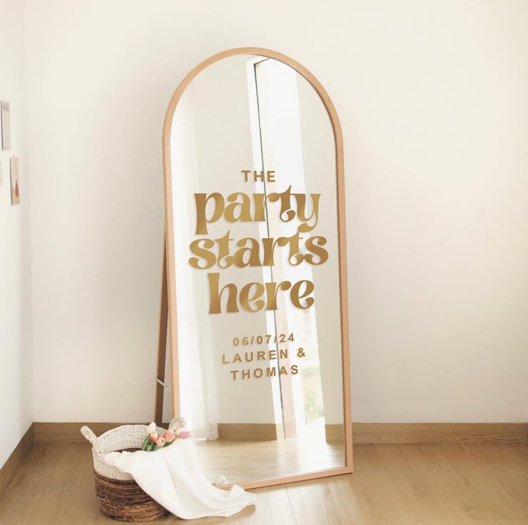 Create a truly unique and personalised touch to your wedding decor with our "The Party Starts Here" vinyl sticker. Transform almost any mirror into a charming wedding sign that welcomes your guests to the celebration. Easy to apply and long-lasting, this sticker adds a special touch to your wedding day.