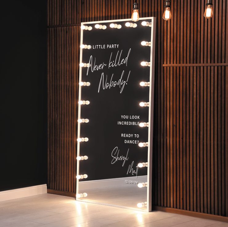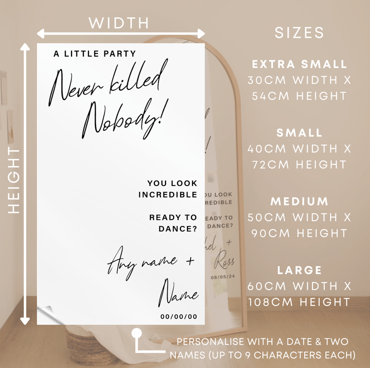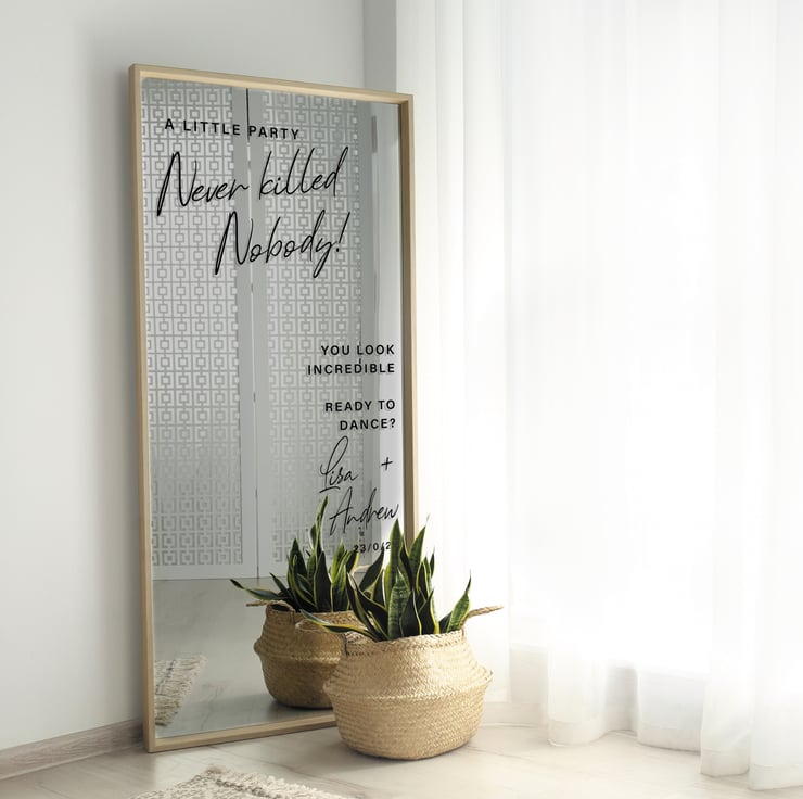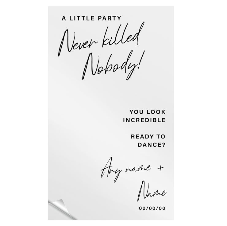 Elevate your wedding decor with our personalised 'A Little Party Never Killed Nobody' Vinyl Mirror Sign Sticker. This stylish and celebratory decal is the perfect addition to your DIY wedding setup. Customise it with your names and the special date, creating a unique piece that reflects your love story.