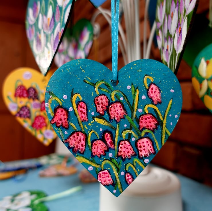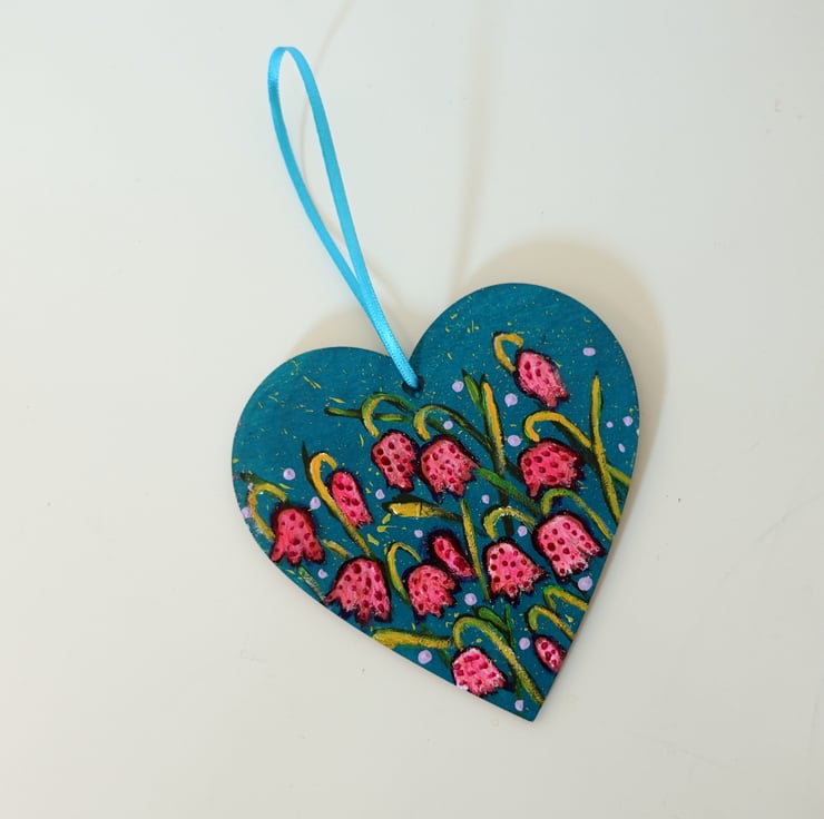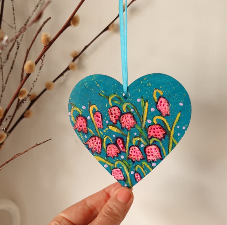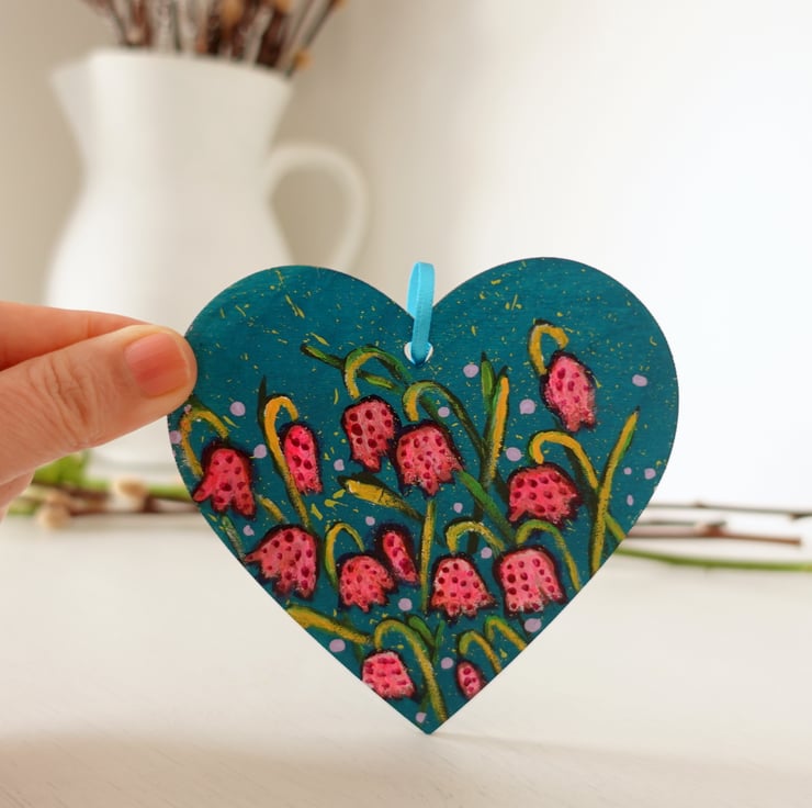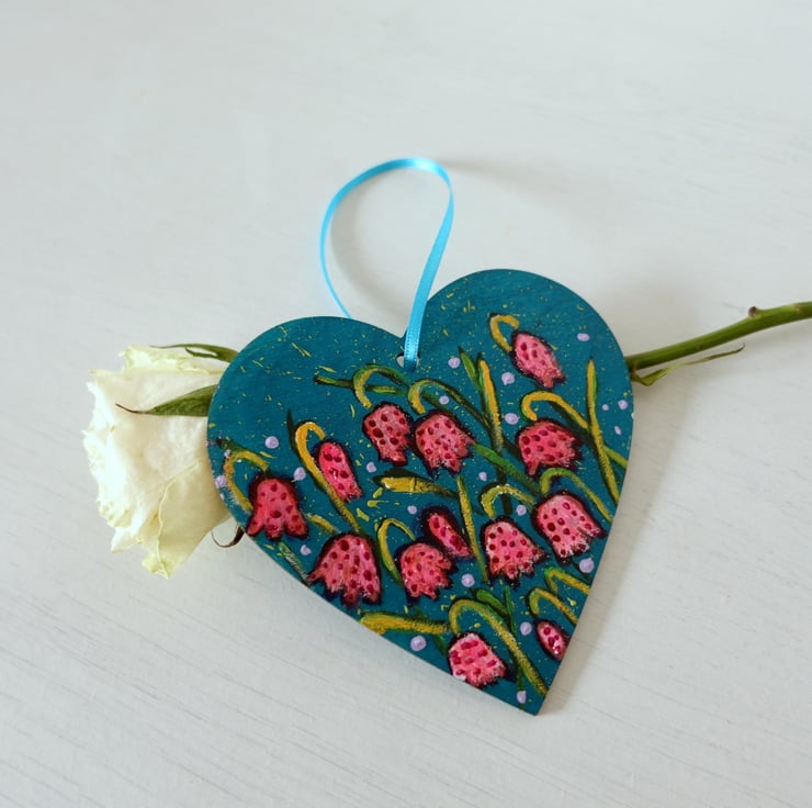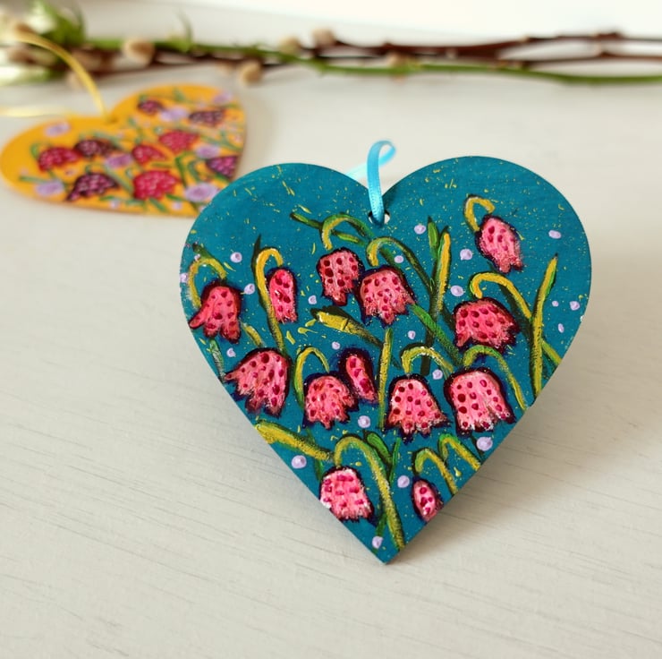 This teal hanging heart features purple-pink fritillaria flowers and it is hand-painted with acrylic paints to look like a mini painting. The brush strokes are visible so this is not intended to be perfect, but to look like an artwork in its own right. The fritillaria flowers are painted in purple with layers of pink to create a beautiful contrast with the teal background and I added green leaves and stems with yellow accents. It also added some lilac dots to create a meadow-like look.