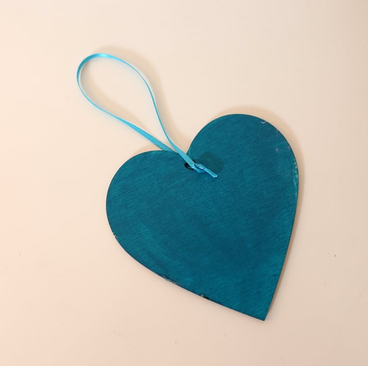 This heart decoration measures 4" x 4", it is painted on the reverse side in plain teal, it is varnished for protection and it has a turquoise ribbon for hanging. Please don't keep this in the sun as the colours may fade over time.