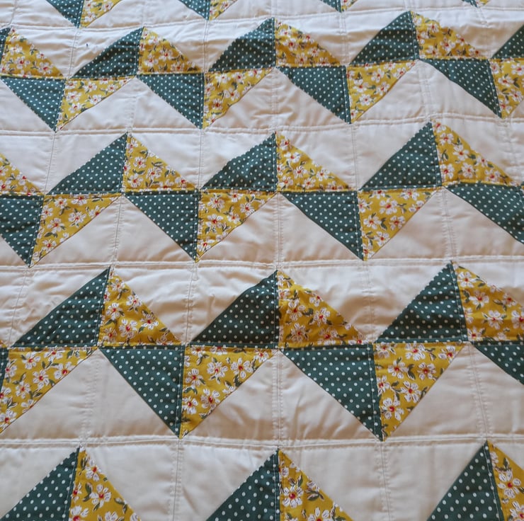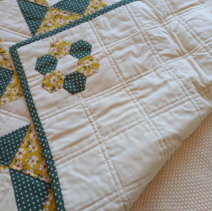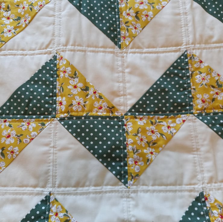 A deep green/cream polka dot fabric combines beautifully with an elegant yellow floral fabric and a simple cream cotton. backed with plain cream cotton and bordered with the deep green/cream polka dot fabric.