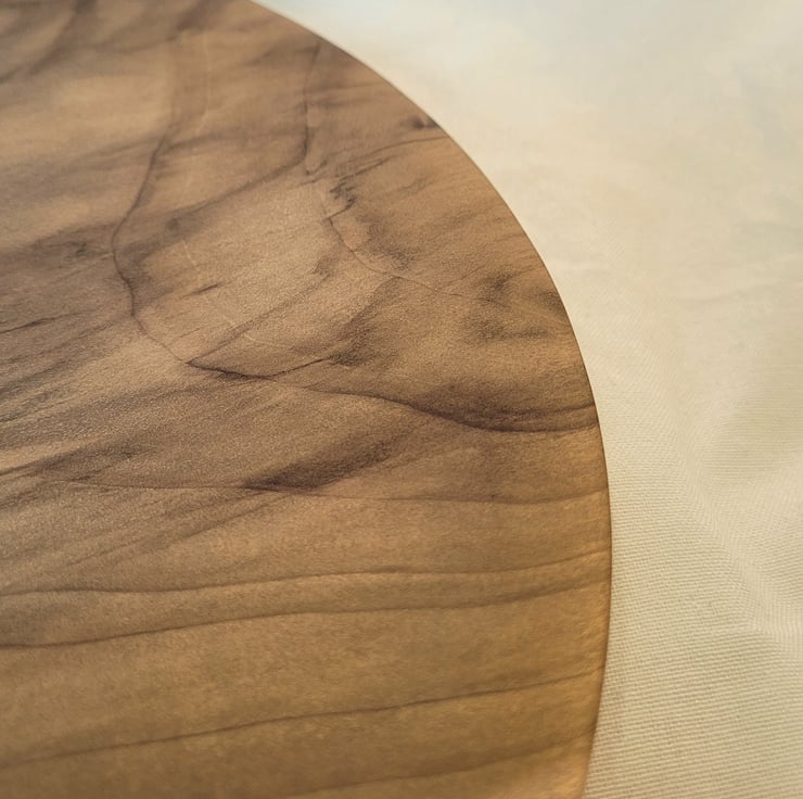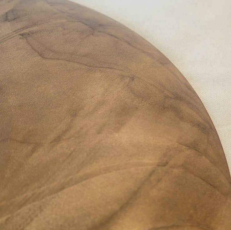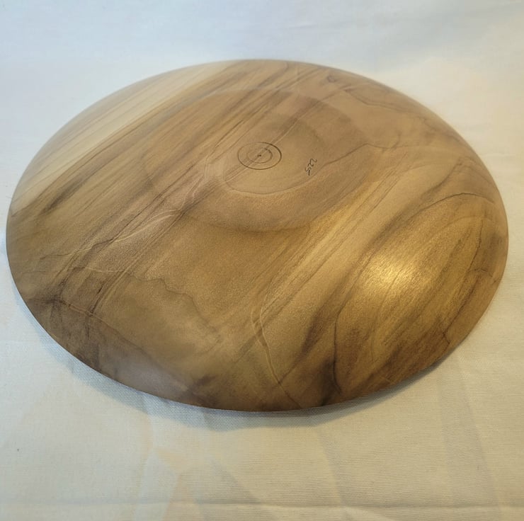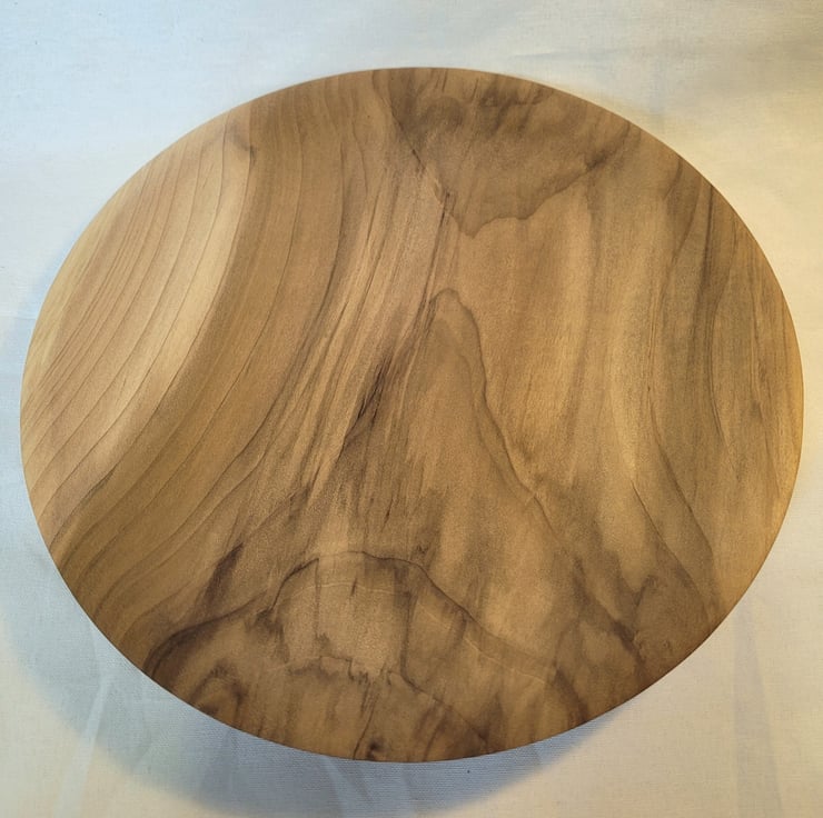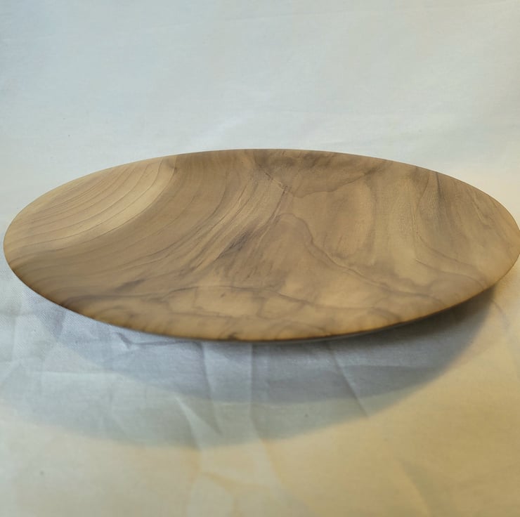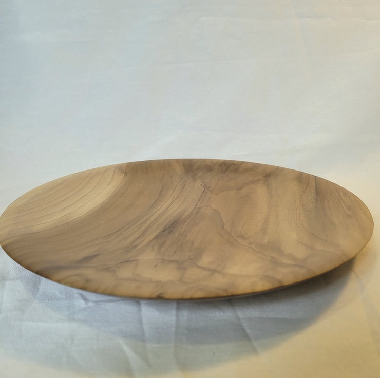 Tulipwood platter, 298 x 28mm (29.8 x 2.8cm) A stunning piece of Tulipwood turned in a gently curving rimless design to show off the grain pattern and colours. It would make a great table centre piece, decoration or serving platter for special events. 3/4 is the greenish brown of heart wood, with dark grain and streaks, with a bit of cream down one side.