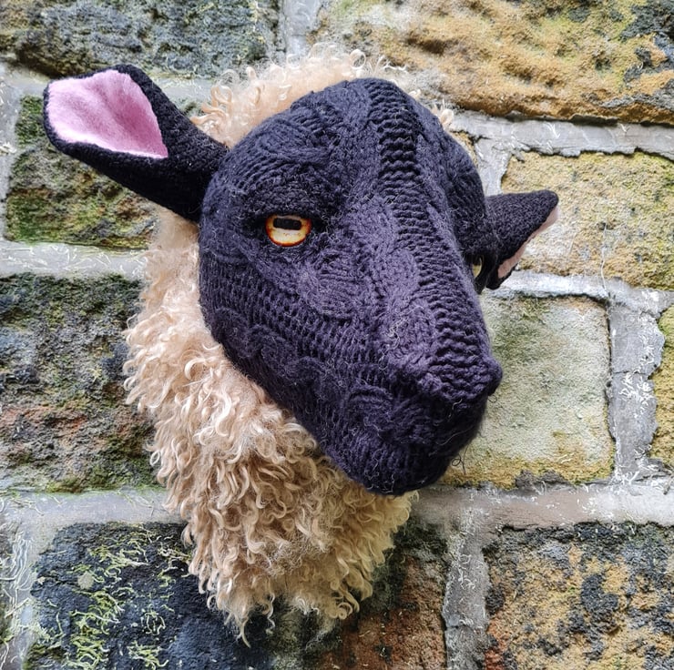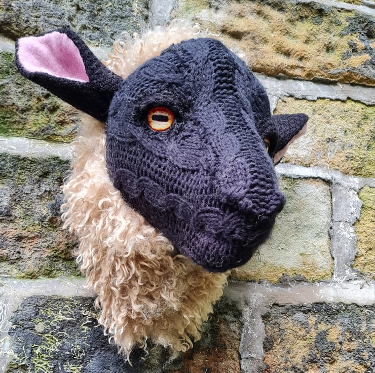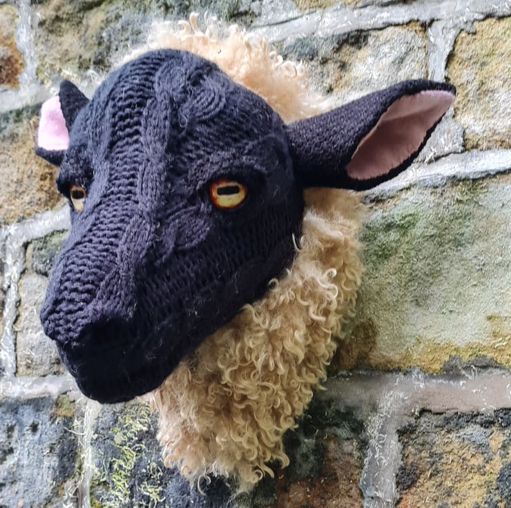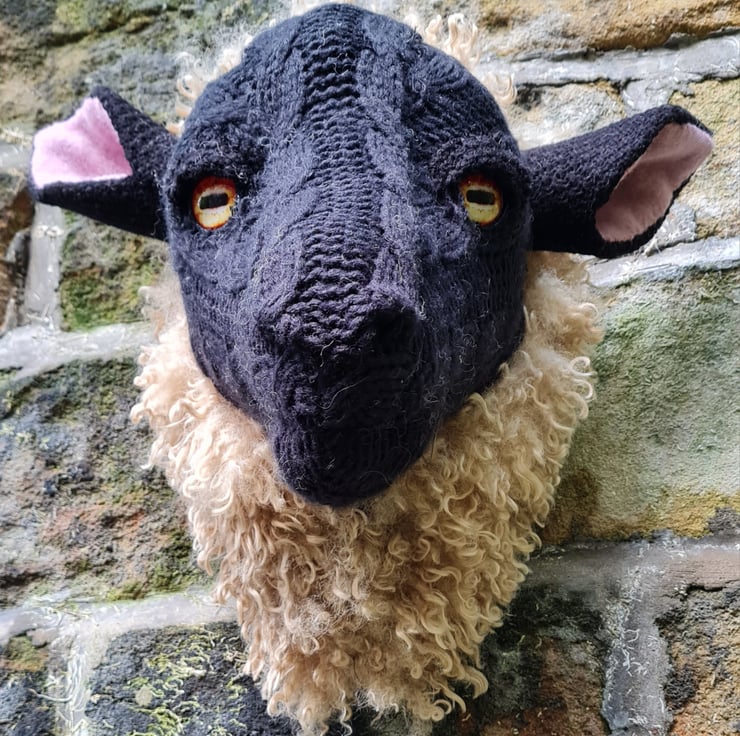 A lifesize faux black sheep head which I have cast myself and covered in hand stitched faux sheepskin and an upcycled black cable knit jumper.
