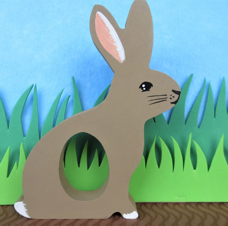 This is a freestanding MDF bunny, which holds a chocolate egg (Creme egg etc - see photos for examples of the eggs that fit).