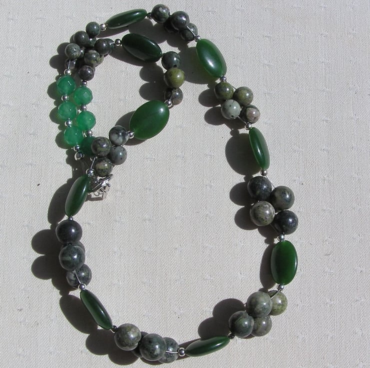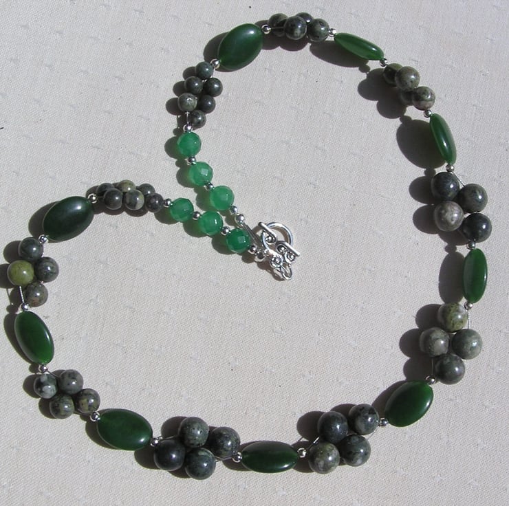 This Stunning Necklace is made from Jade & Jasper Beads – Dark Green Nephrite Jade beads separated by Kambamba Jasper beads which are clustered together in four’s and six’s and then a final flourish of faceted Green Jade round beads - a Beautiful ‘Back to Nature’ combination that will look stunning either worn casually or with something more Elegant for a Special Evening out