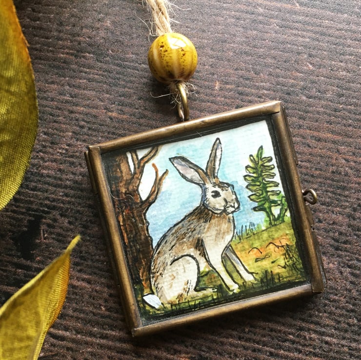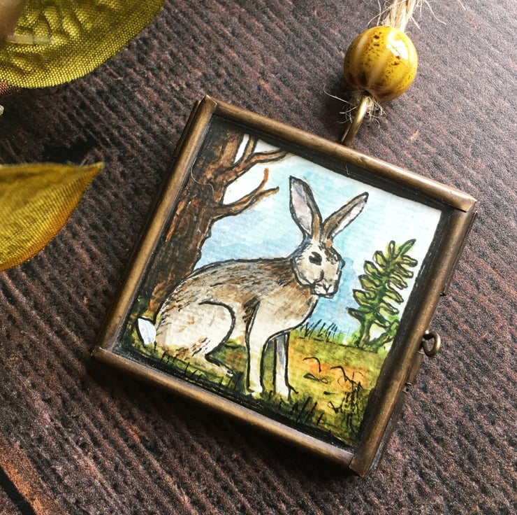 It's been created using pen, acrylic paints and tiny brushes! It's housed in a small shabby-chic metal frame. The frame measures approximately 4cm square and has a twine hanging loop with a pretty ochre coloured ceramic bead.