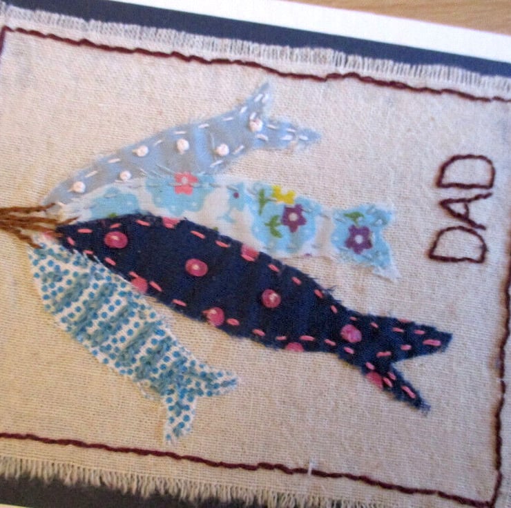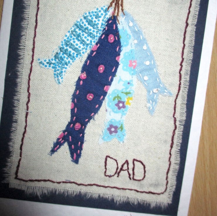 Fabric fishing card for Dad, created from an A6 (105 x 148mm) folded white hammer textured card stock and a dark blue card mount, featuring freshly caught hanging fabric fish in various blue shades and patterns, with a embroidery and bead detail.