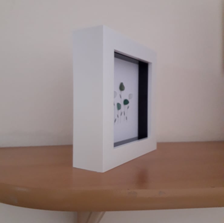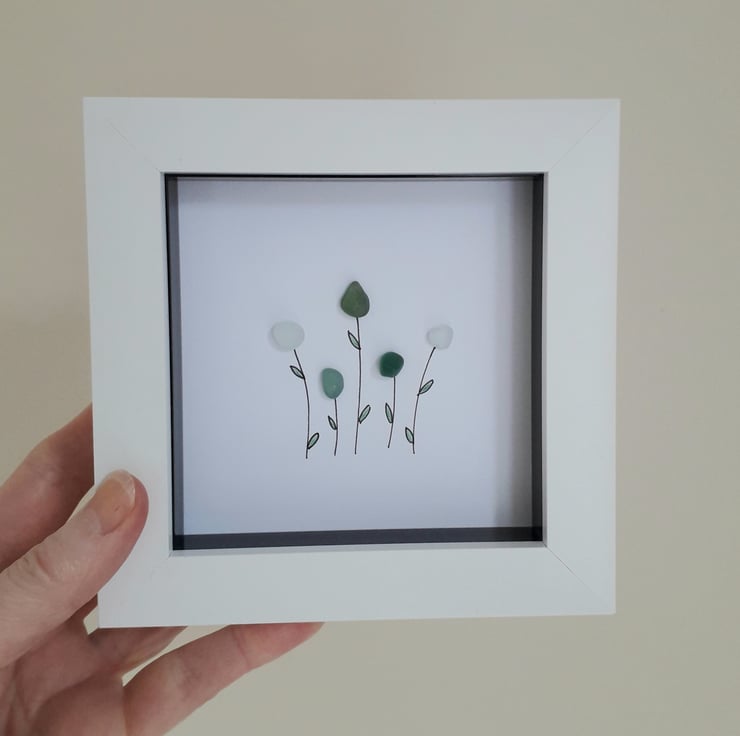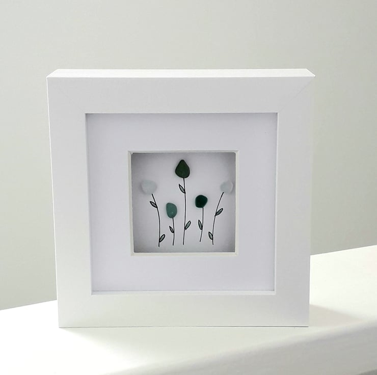 Sea Glass Flower Art - natural sea glass in coastal colours of aqua, green and blue. I love making flowers from sea glass! These pretty framed pictures are delicate and elegantly simple and will make a lovely gift for any occasion. The artwork is mounted on white card in a high quality, white contemporary frame with a high shine to the glass (12 x 12 cm) 5 x 5 inches. You can choose with or without a mount.