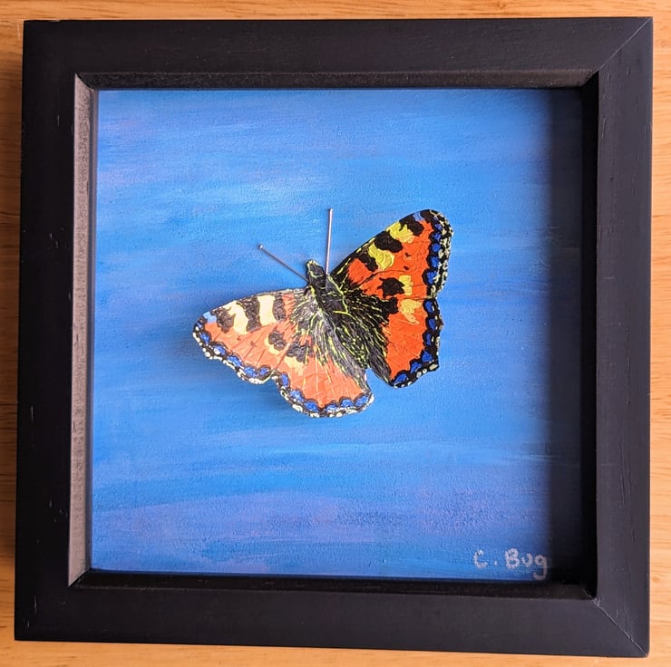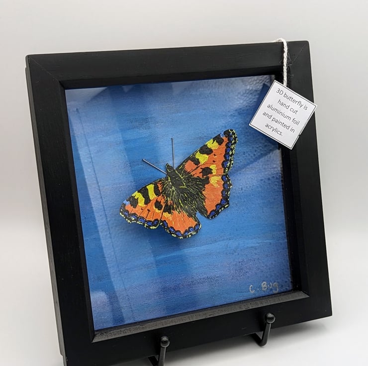 Details: Original artwork, acrylic painted foil butterfly, which is 3D in effect glued into a backboard painted in acrylics in a blue sky effect. The antenna are made from sewing pins.
