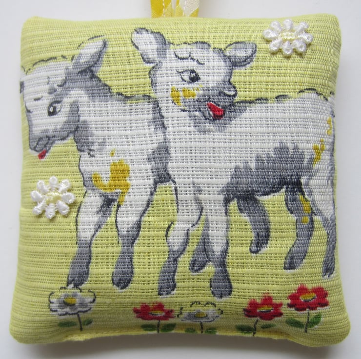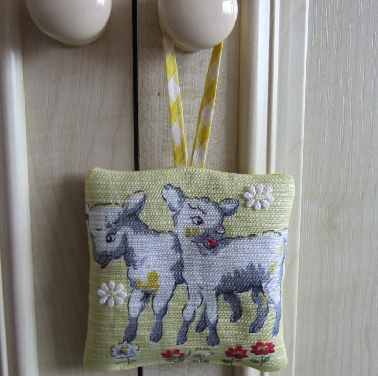 Hanging lavender sachet made from an unused vintage 1950s fabric featuring 2 lambs and decorated with 2 lace daisies. It is backed with yellow and white check gingham fabric.