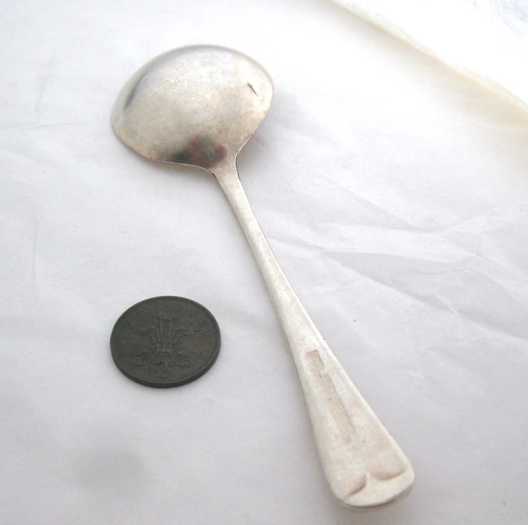 Please note this is a vintage spoon (I think it's 1920s to 1930s) so it does have tarnish, hairline scratches and wear marks that make it look a bit battered, although these in no way affect its functionality as a spoon and it is honestly shinier than my photos make it look. I have reduced the price to a fiver and put it in the bargain bin anyway.