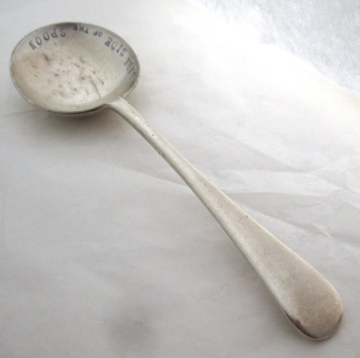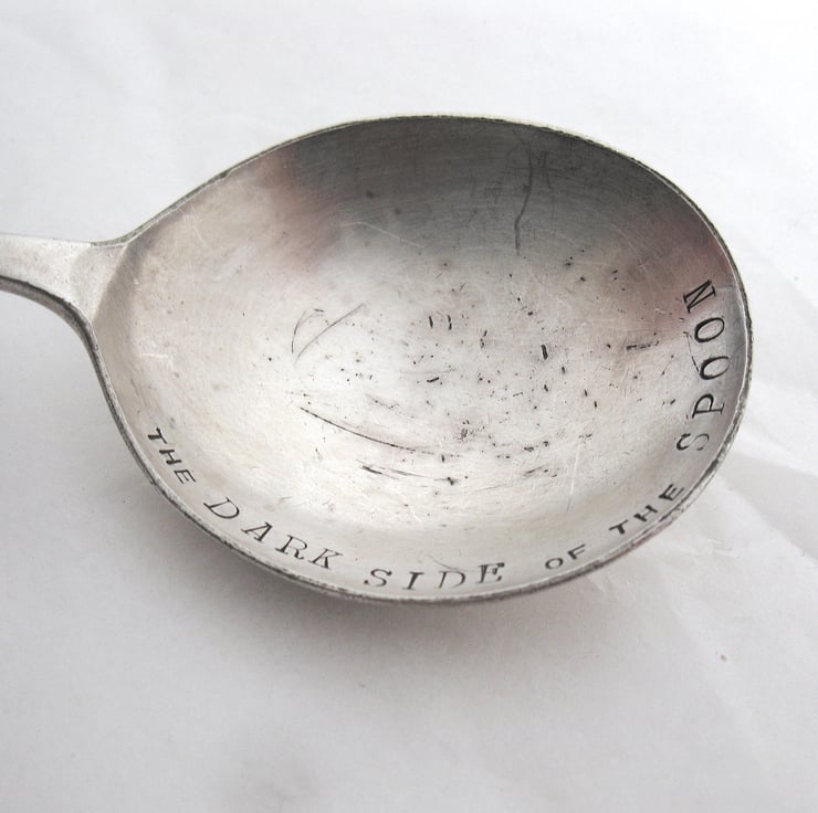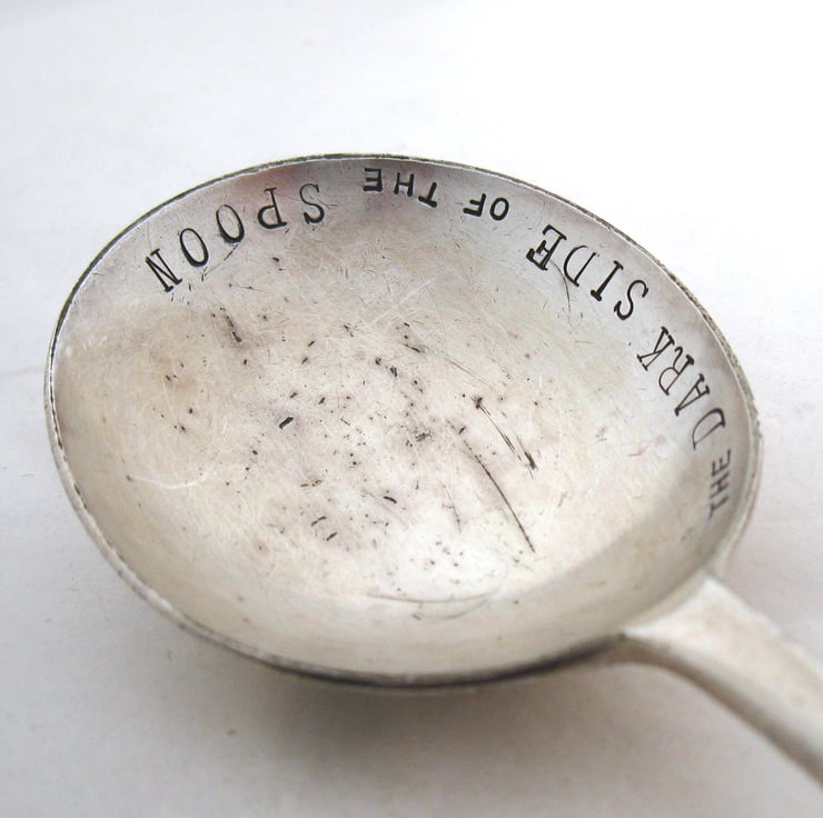 A hand stamped vintage silver plated soup spoon with the words 'THE DARK SIDE OF THE SPOON' inside one edge of the bowl. It's a plain 'old english' style spoon measuring approximately 17.5cm long.
