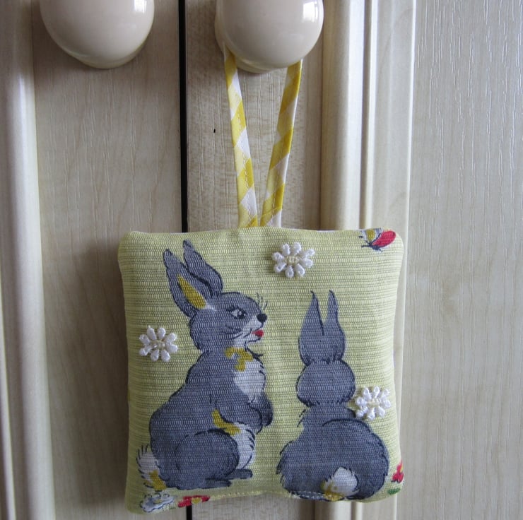 Hanging lavender sachet made from an unused vintage 1950s fabric featuring 2 bunny rabbits and decorated with 3 lace daisies. It is backed with yellow and white check gingham fabric.