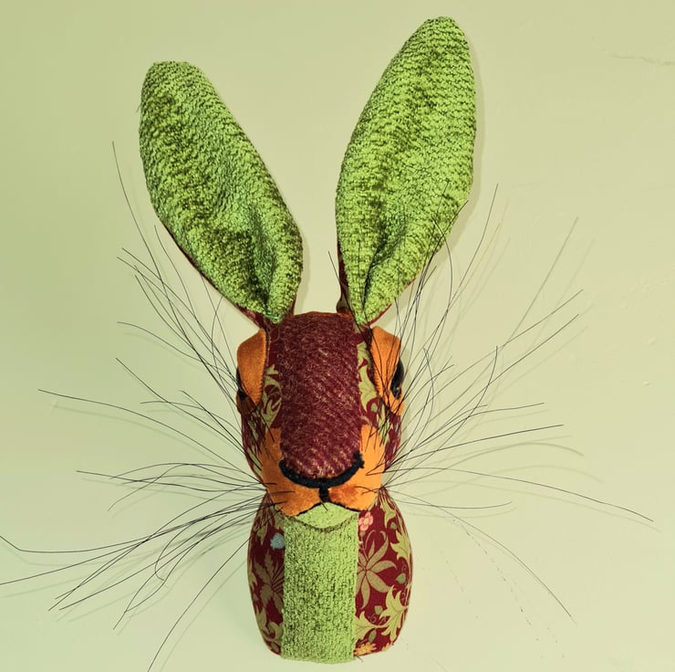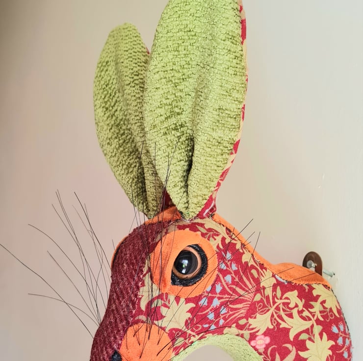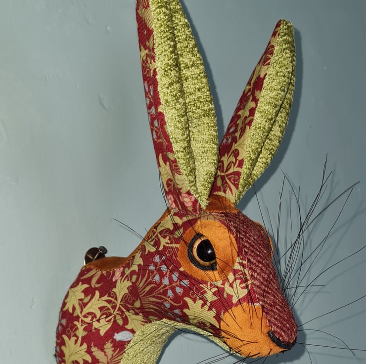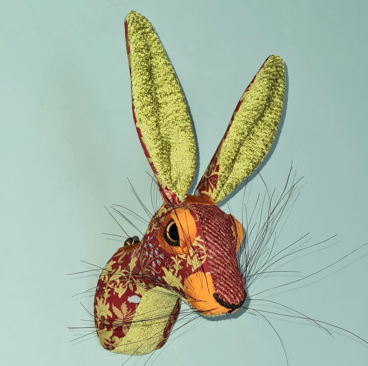 A lifesize faux hare which I have handmade and covered in hand stitched turquoise , teal and orange May Morris red and sage green leaf fabric. The head is backed with felt and has a metal hanger to hang it on the wall. It is lightweight.
