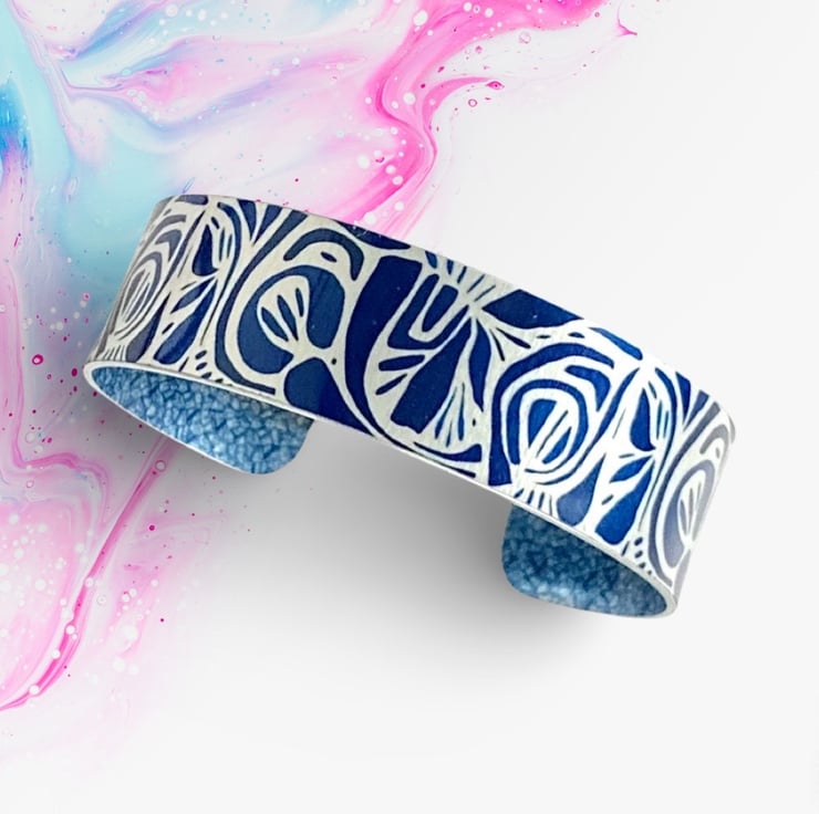 This is a cuff bracelet which I have handmade, and added a blue abstract, artistic design. This bracelet can be engraved with a personal message on the reverse for a small extra fee (Optional). Matching earrings and pendant are available.