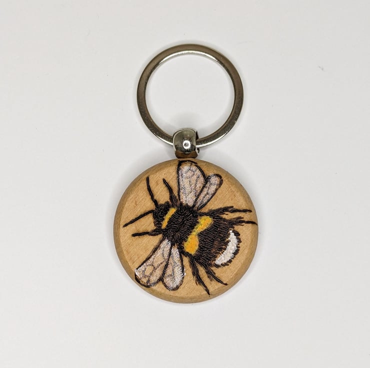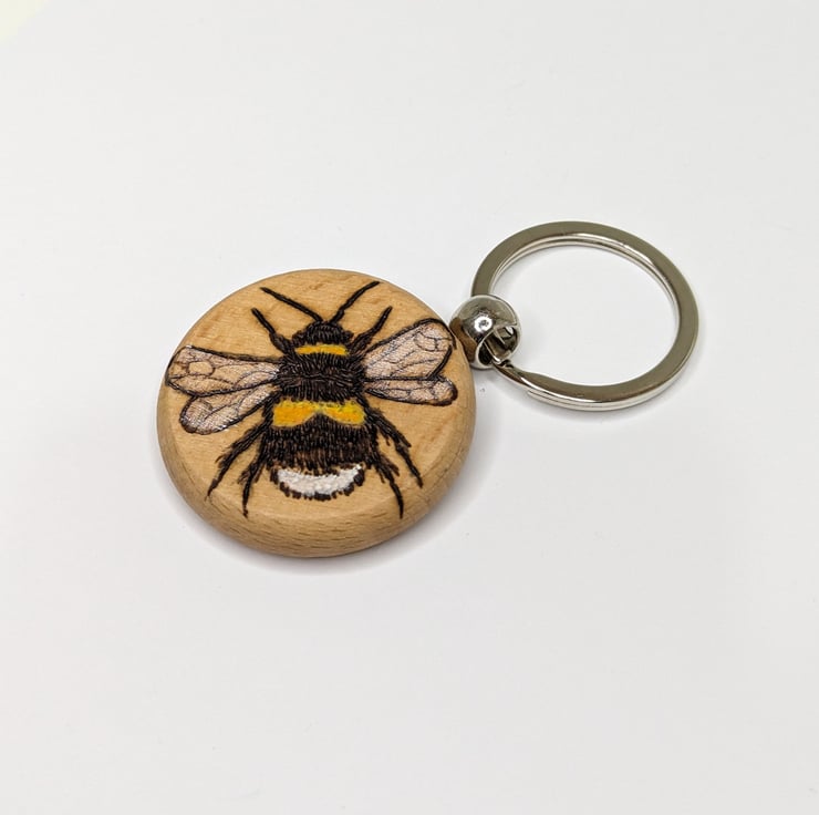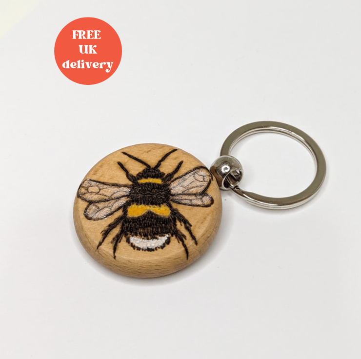 Wooden keyring which has been lovingly hand burnt with a bumblebee using the art of pyrography and coloured using acrylics and then varnished. This solid keyring would make a great gift for a bee lover.