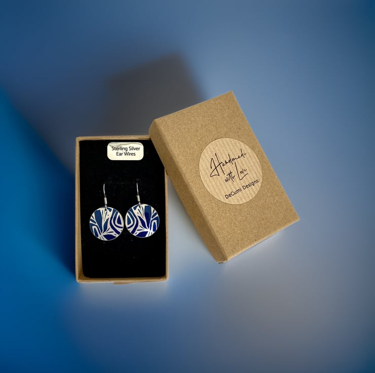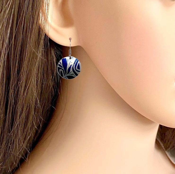 I have handmade the discs and artwork for these earrings, and the drops have a blue abstract design, An ideal gift for someone who loves artistic jewellery. Matching bracelet and pendant available.