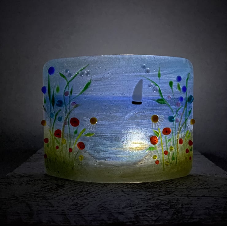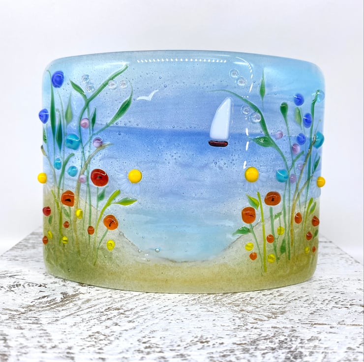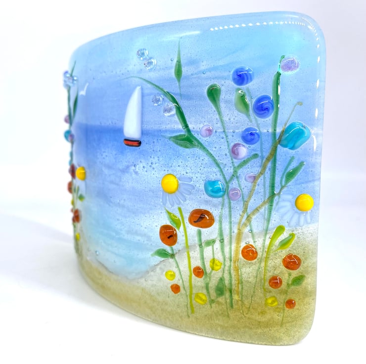 The flowers and foliage have been created using a lamp work torch prior to fusing - this allows me to mix colours, add elements of sparkly dichroic glass and create a lot more detail. The boat his a beautiful iridescent sail and the hull is made from shiny Dichroic glass which catches the light beautifully.