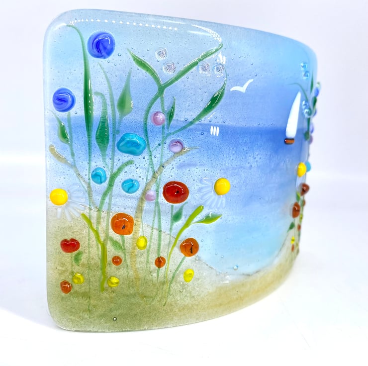 A pretty, free standing glass curve with a gorgeous seaside scene and wild flowers.