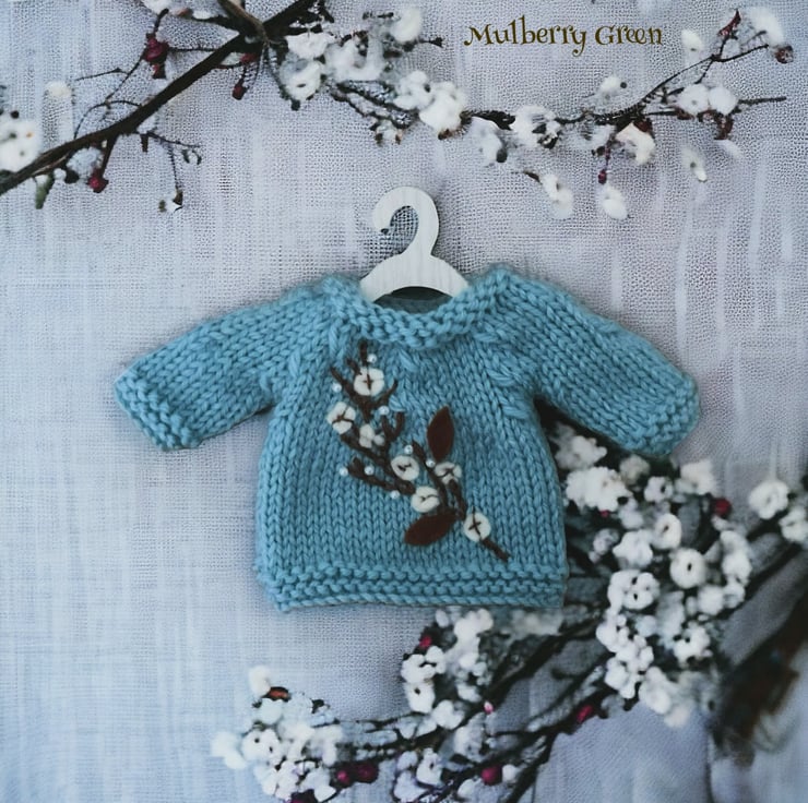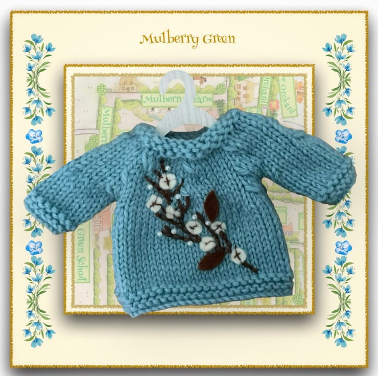 A beautiful pure wool turquoise jumper, embroidered with blossom and pearls, to fit the Mulberry Green characters. The jumper is hand knitted and fastens with a little popper at the back.