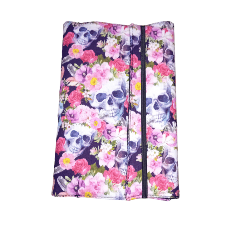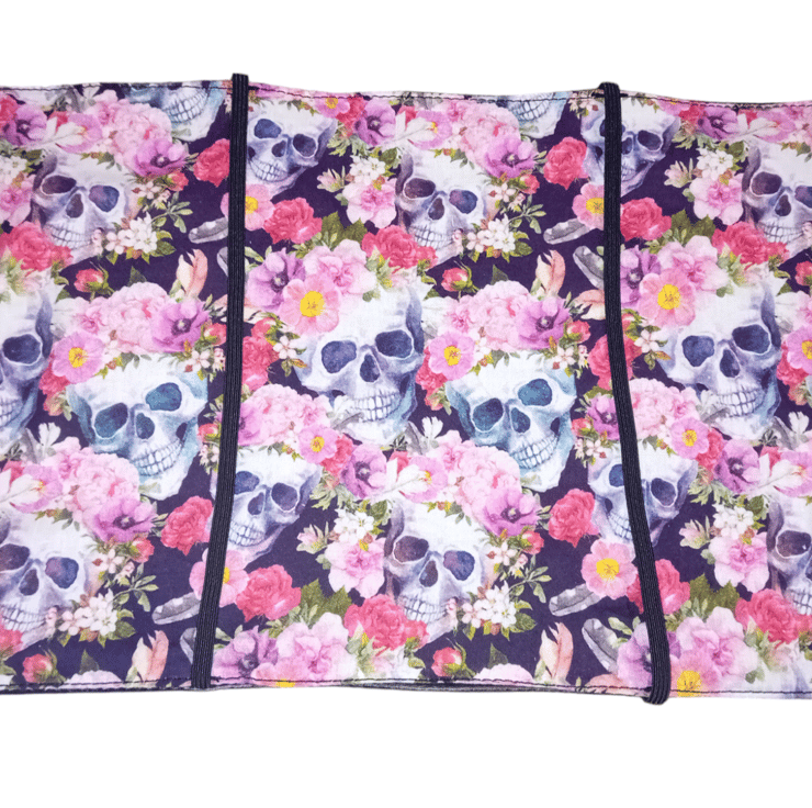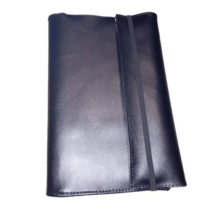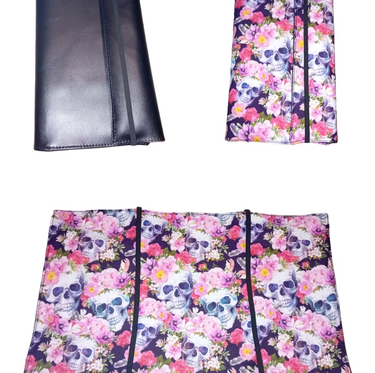 A reversible, reusable A5 notebook/diary/reading book cover with black leatherette on one side and the other side is patterned cotton.