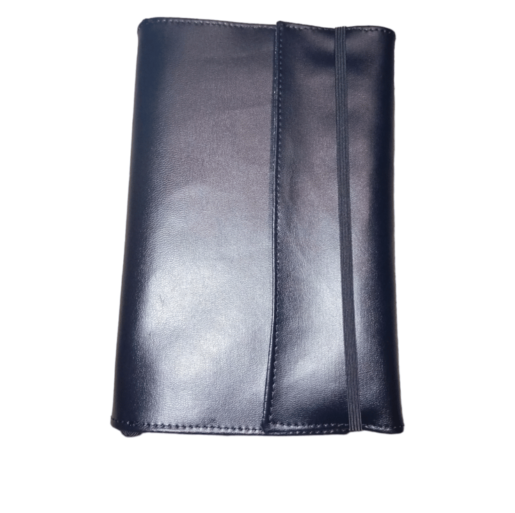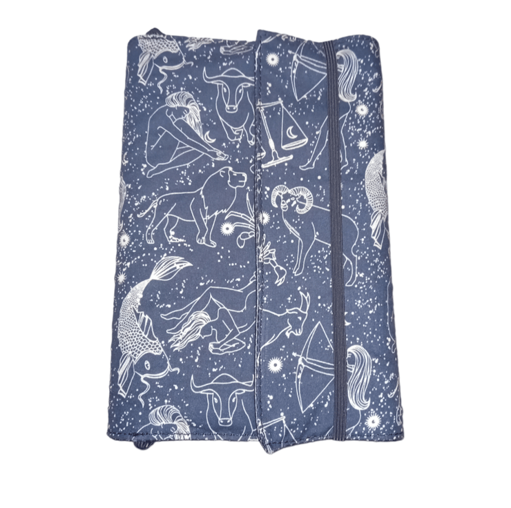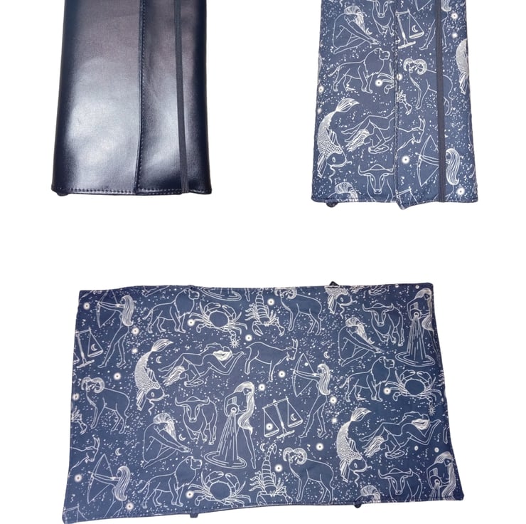 A reversible, reusable book cover. Suitable for A5 notebooks, diaries or reading books. One side leatherette, one side patterned cotton.