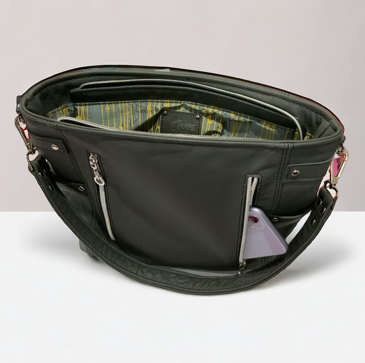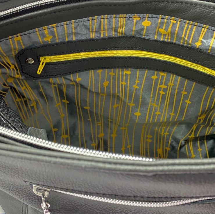 Picture this: rescued dark grey leather, a pop of playful grey and yellow silk lining, and elegant silver hardware – all coming together to create the ultimate fashion sidekick. With zip pockets and slip pockets galore, this bag is basically your personal organization guru on the go.
