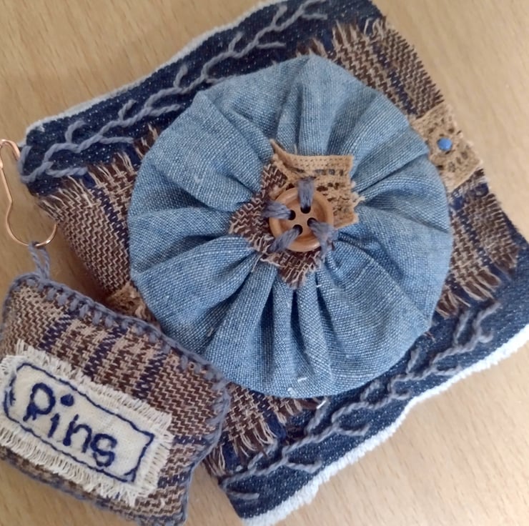 The mini pin cushion (4.5 x 3.5 cm) is in the same check fabric with blanket stitch edging , stuffed with fibrefill and a "Pins" label.