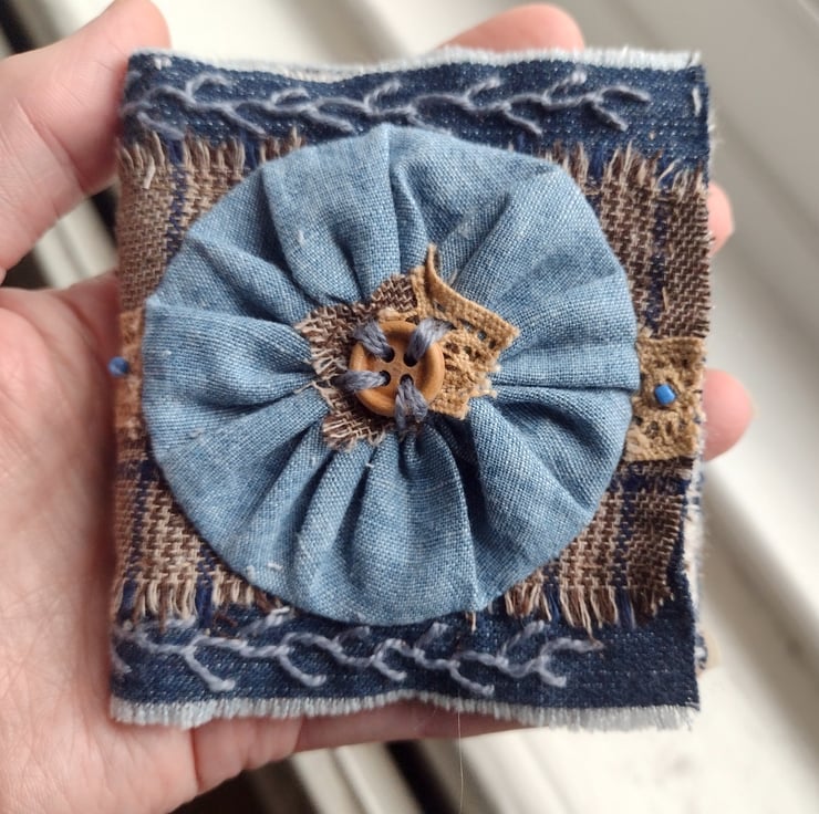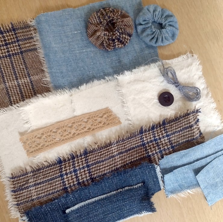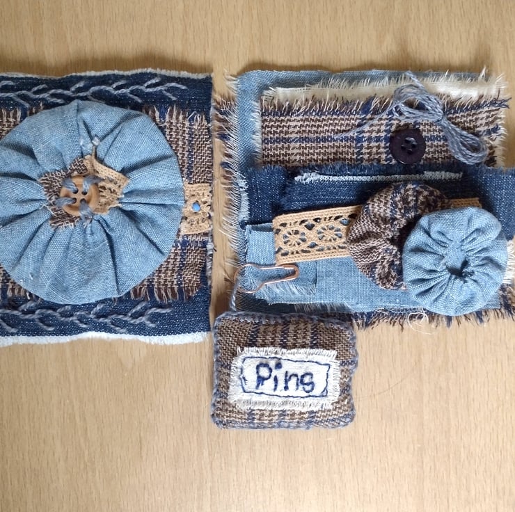 Handmade mini fabric stitch book with mini pin cushion and small pack of matching fabric scraps, lace, thread, a button and two handmade small Suffolk puffs (Yo Yo's)