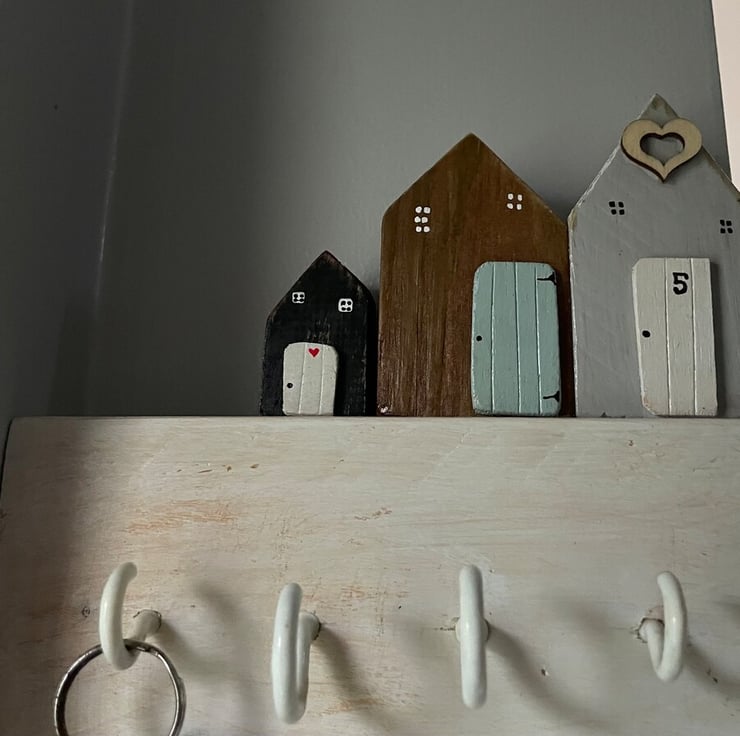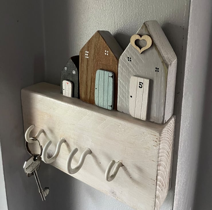 Individual key holder with up to 3 little wooden houses made from recycled or reclaimed wood. Personalised to your requirements in a design and colour of your choice.