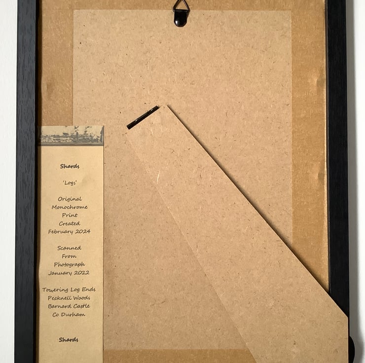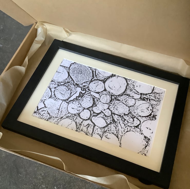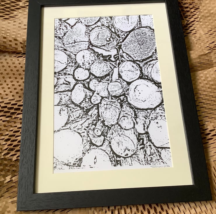 Close up of log ends with fell cuts and tree rings. Photograph as taken, scanned, enhanced and printed on recycled 180gsm Bristol Board with thermal ink. The black has a slight sheen which adds to the overall affect. Striking patterns, interesting negative shapes and dark outlines.