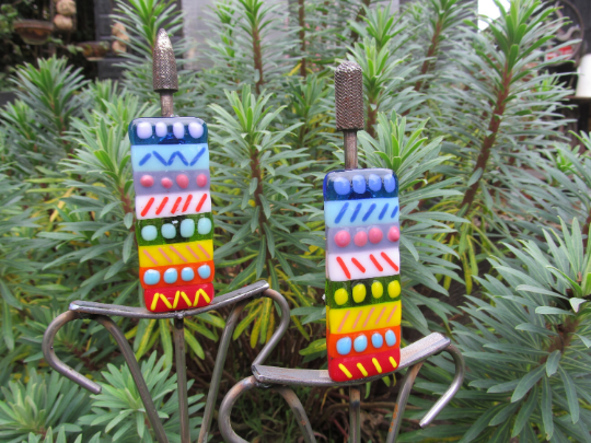 The main part of each bulrush consists of a fused glass panel made in our Hippy Rainbow design. Each panel consists of strips of coloured glass decorated with glass stripes and/or nuggets in complimentary tones to really make the colours pop. There are a mixture of bright and cheerful colours in each panel.