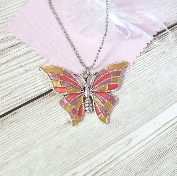 Painted with gold, rose gold and a pinkish enamel, this silver metal butterfly is presented on a Stainless Steel ball chain. Each pendant is painted individually - a custom design in your favourite colours can be created upon request.