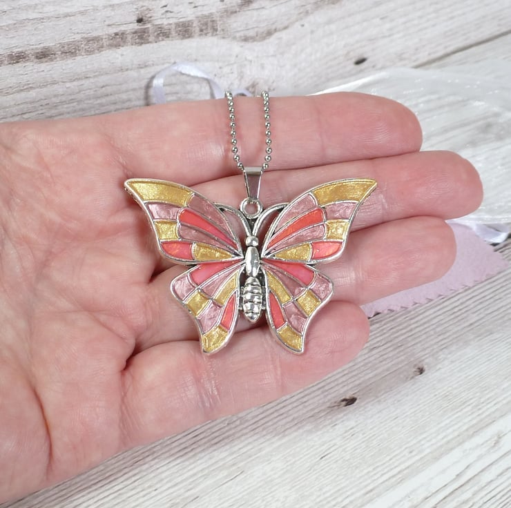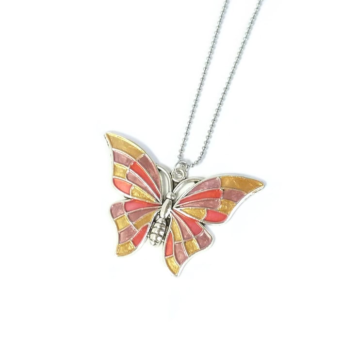 Painted with gold, rose gold and a pinkish enamel, this silver metal butterfly is presented on a Stainless Steel ball chain. Each pendant is painted individually - a custom design in your favourite colours can be created upon request.