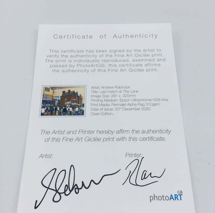 Titled ‘ Last match at the Lane’ this is a unique print direct from myself the artist. My artworks are a celebration of the match day experience and of stadium architecture.